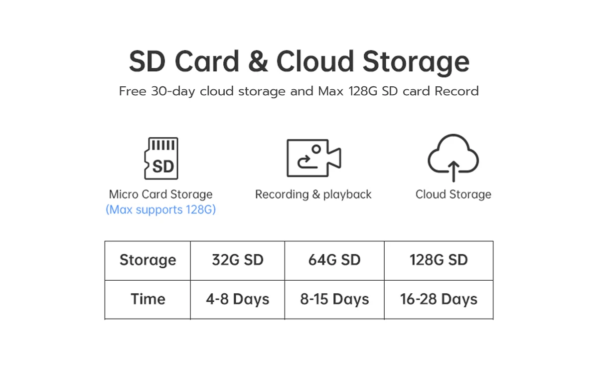 *SD Card & Cloud Storage.Free 30-day cloud storage, data security is more stable