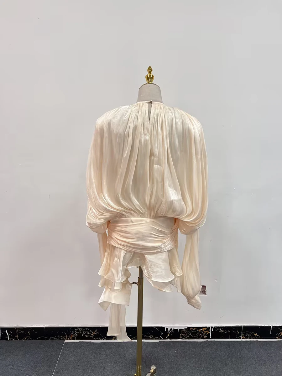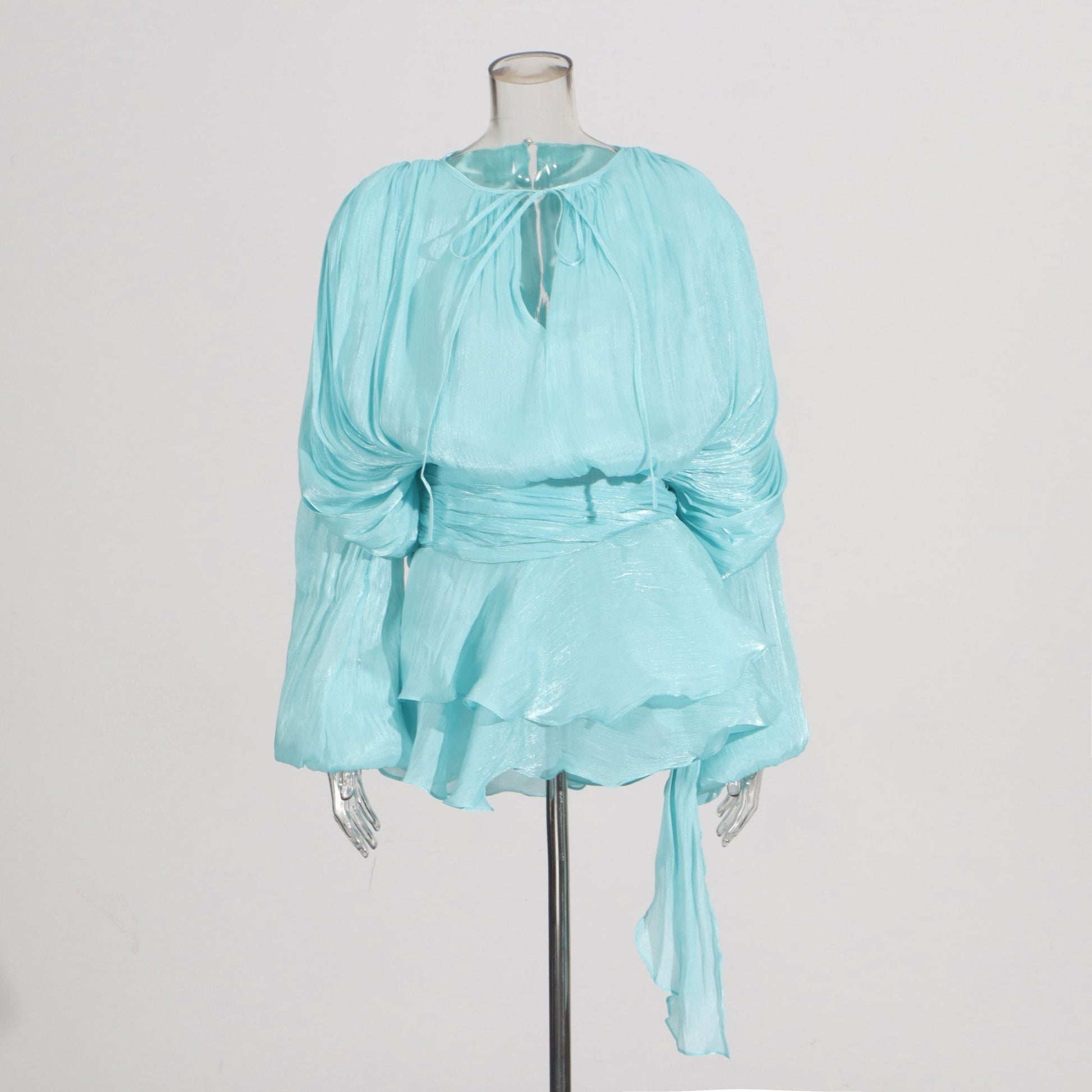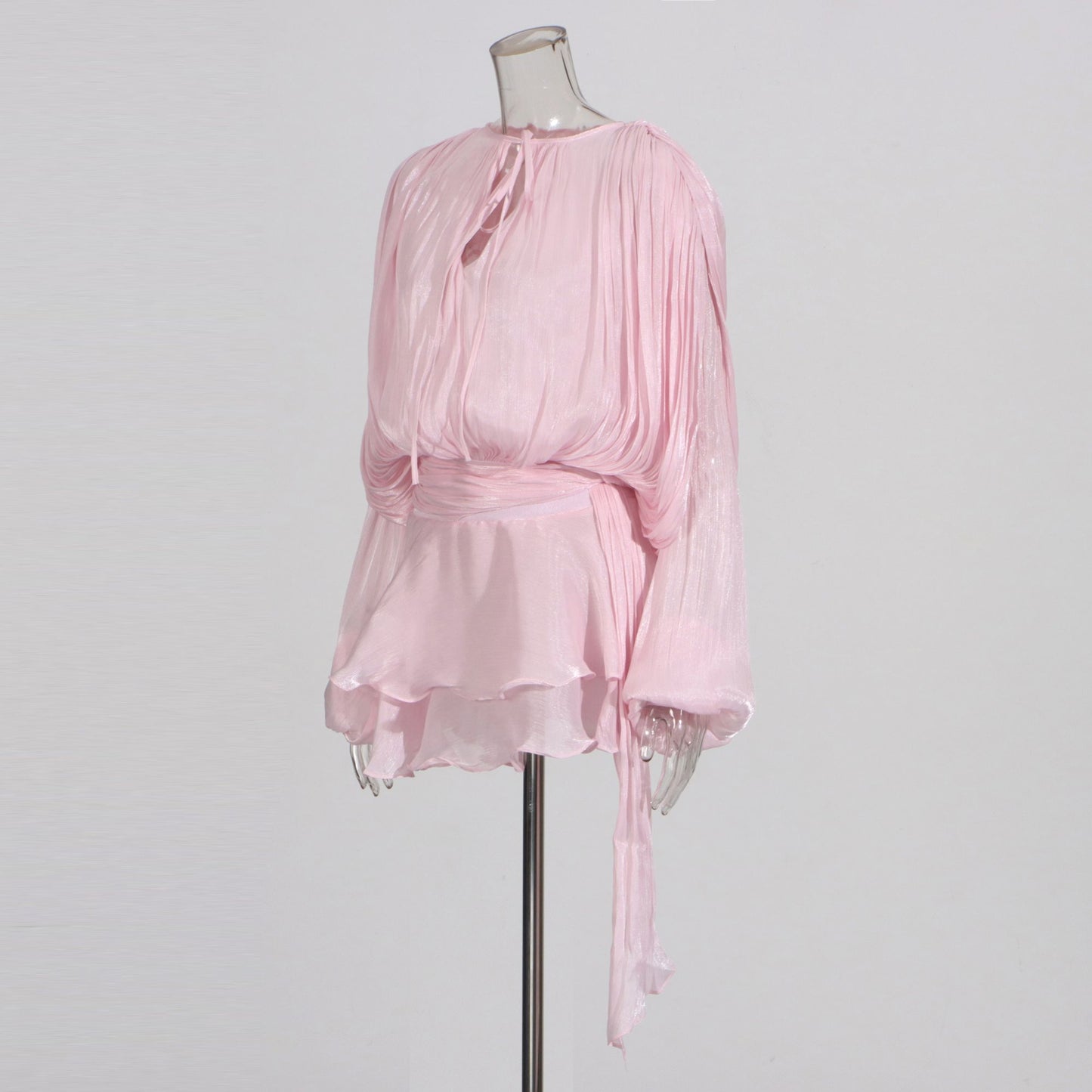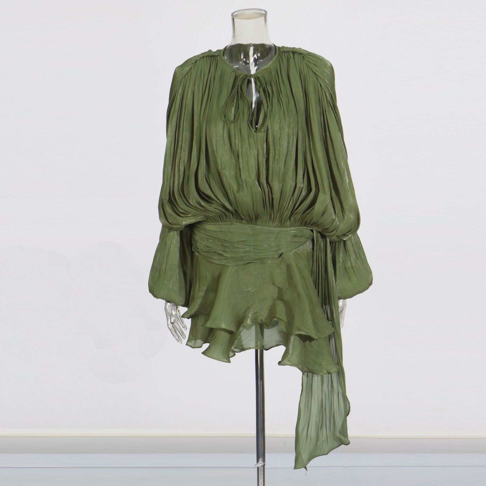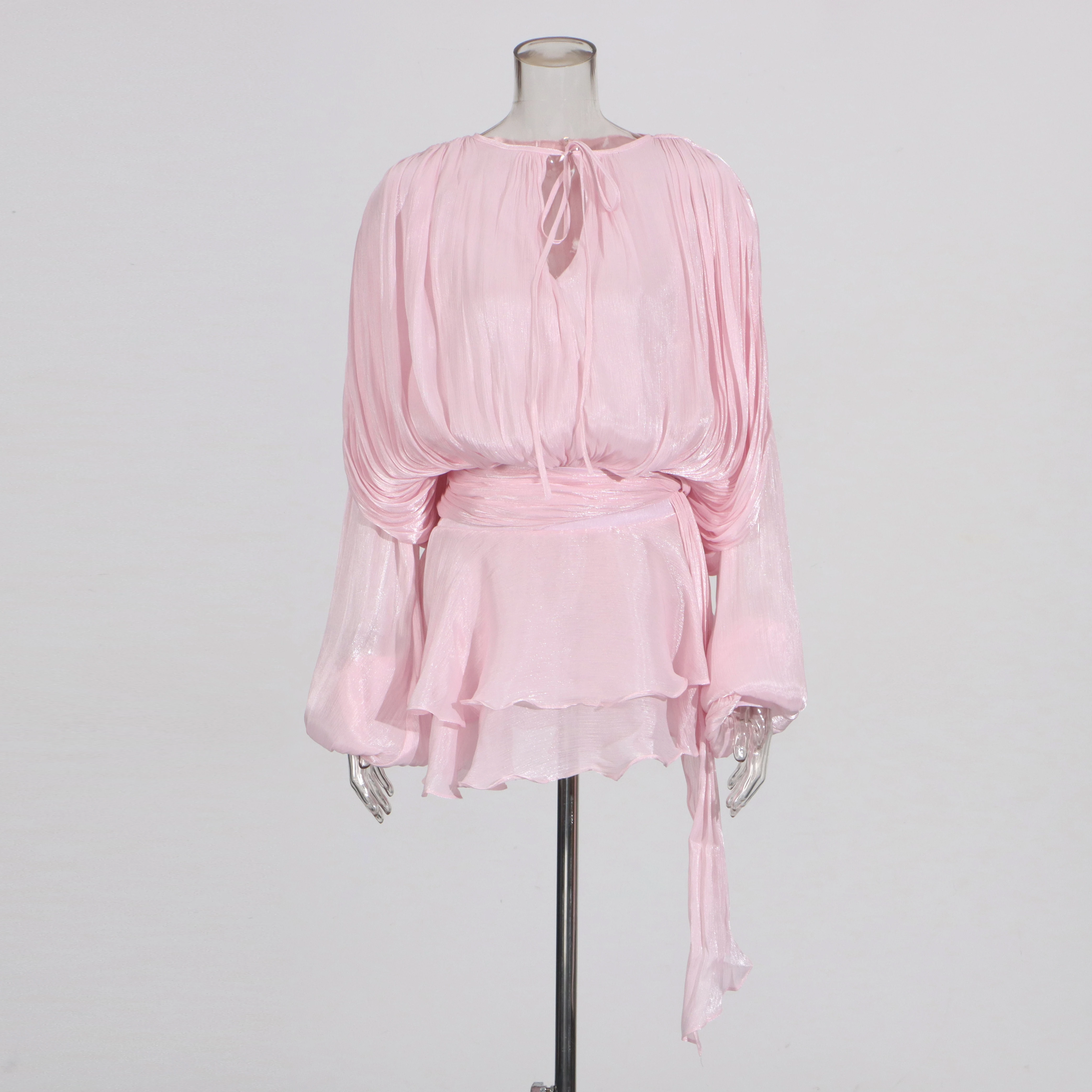 KBQ Solid Patchwork Lace Up Loose Dresses For Women O Neck Long Sleeve High Wais