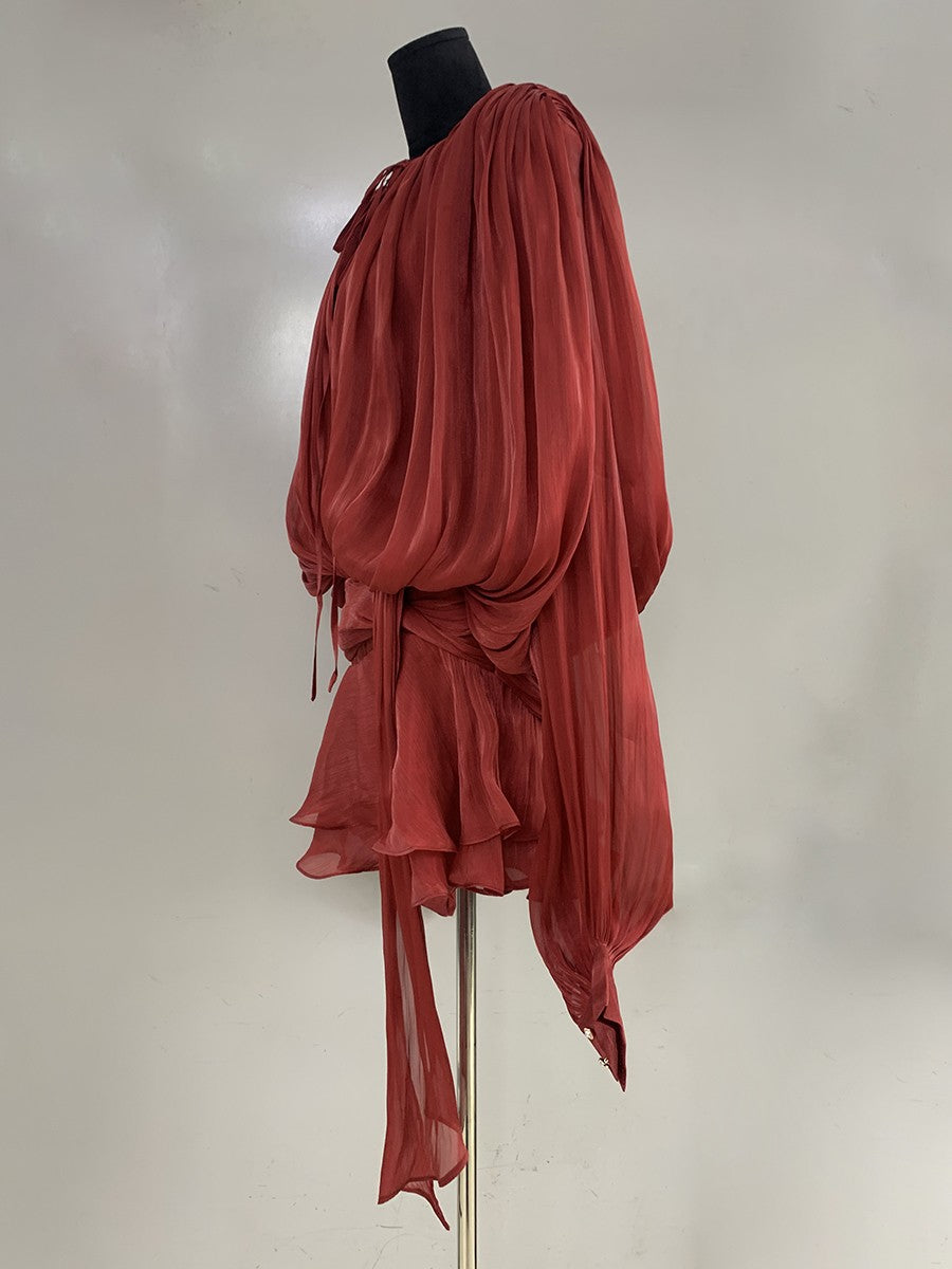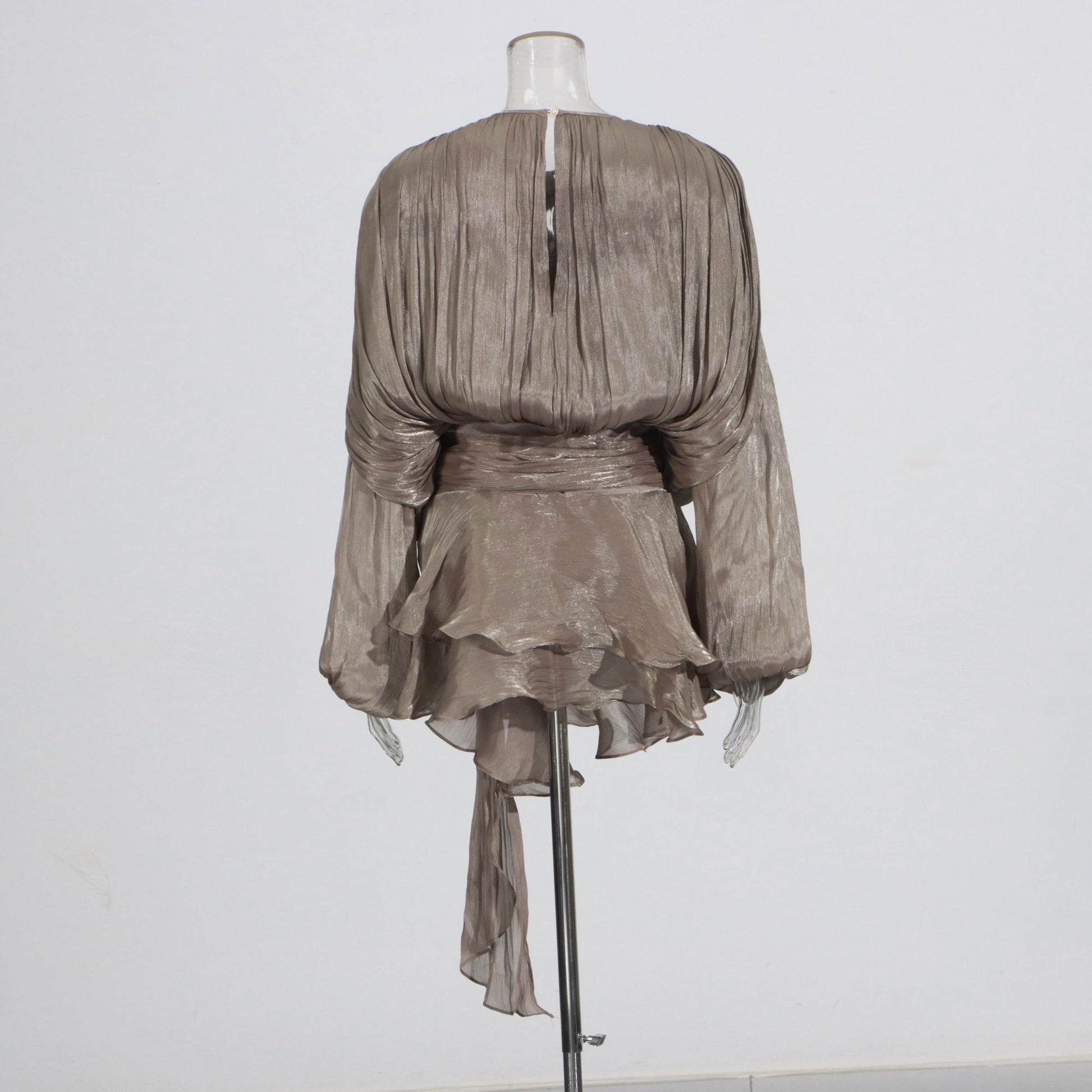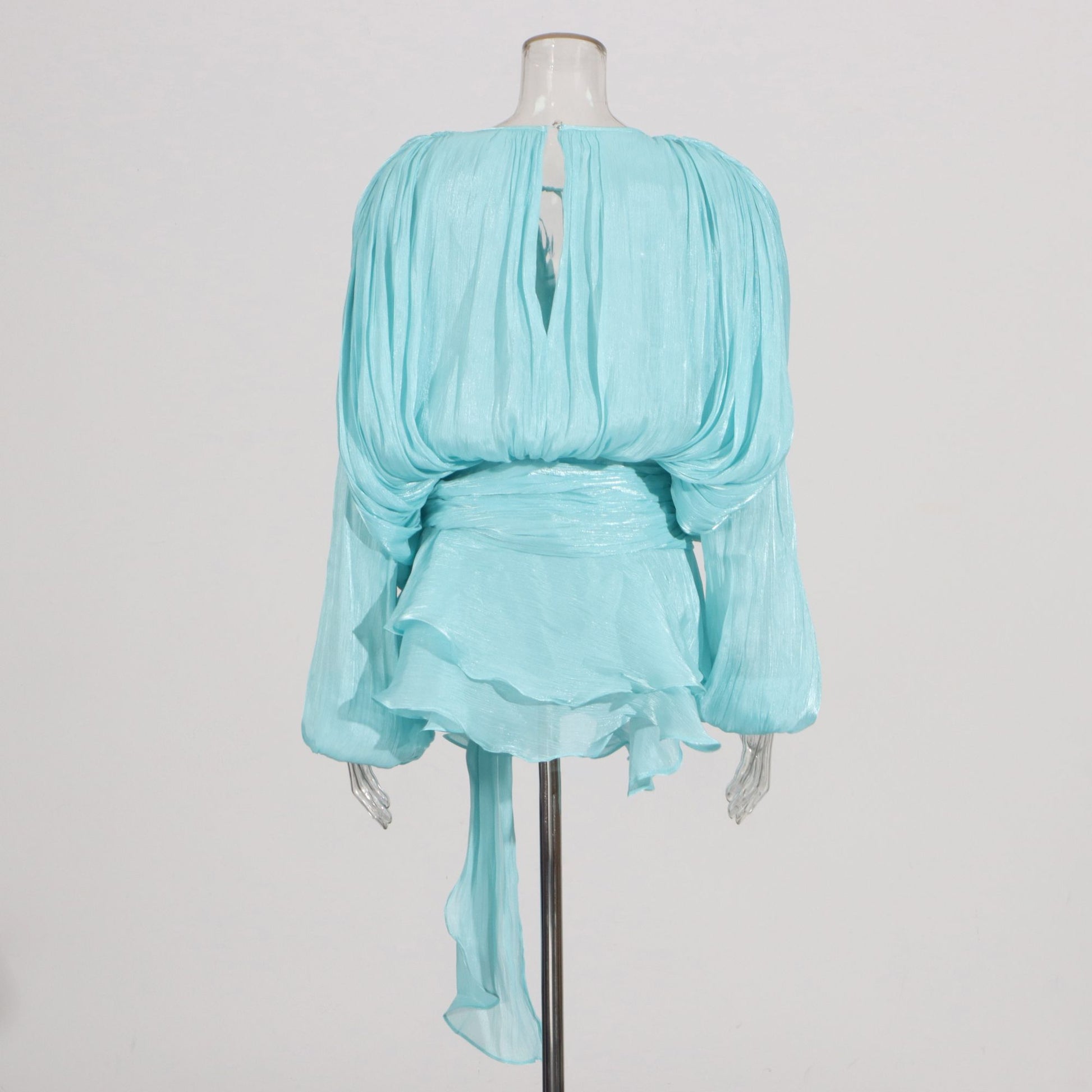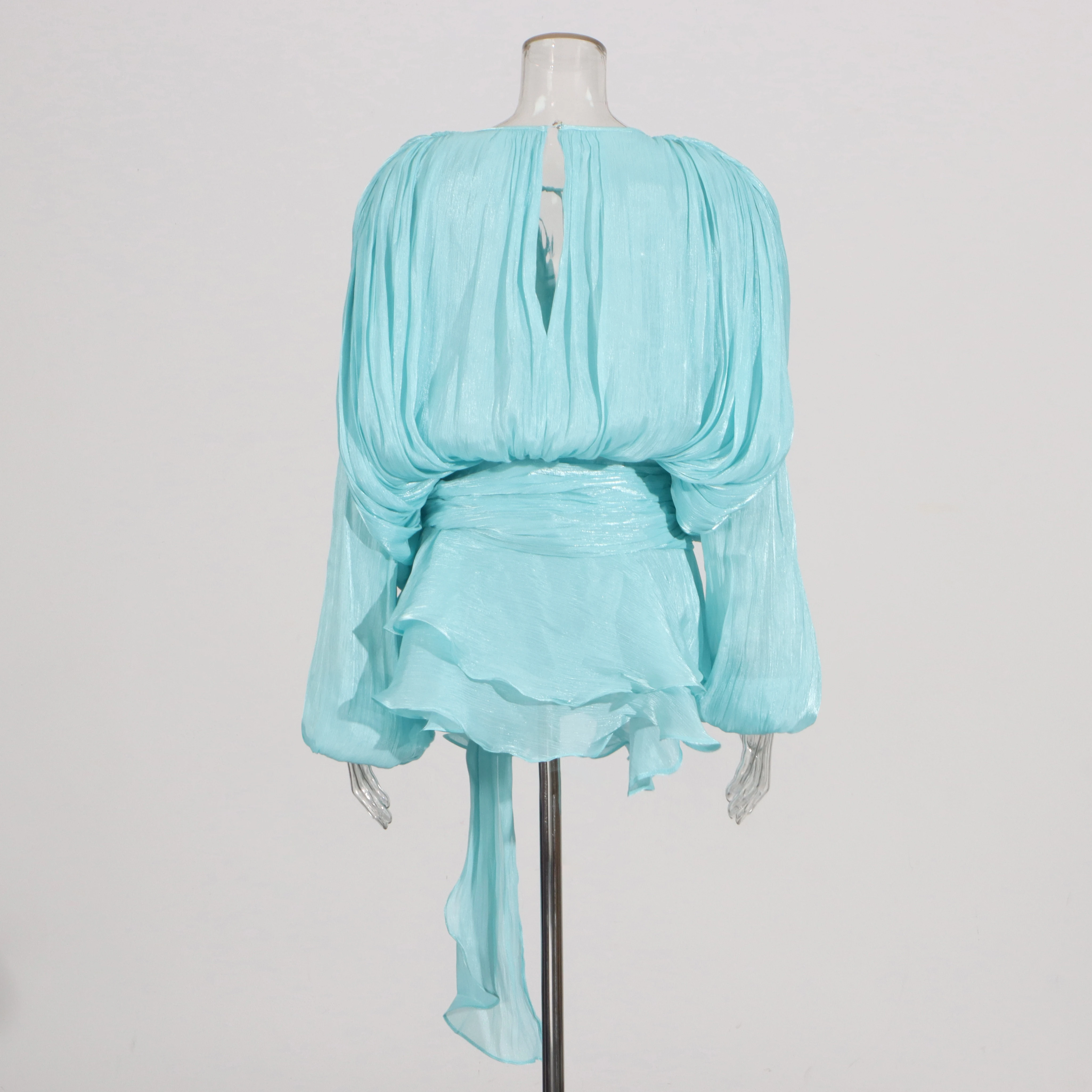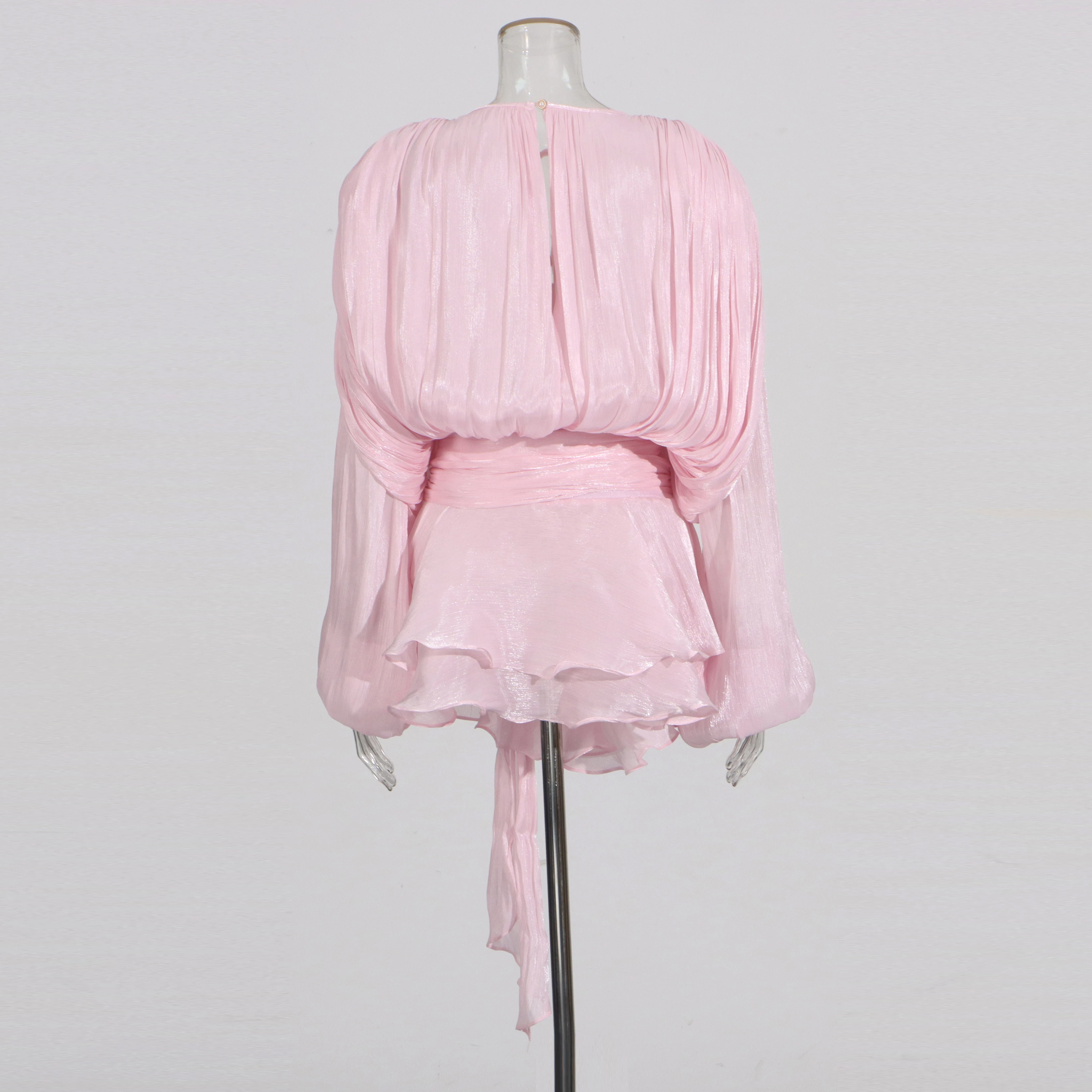 KBQ Solid Patchwork Lace Up Loose Dresses For Women O Neck Long Sleeve High Wais