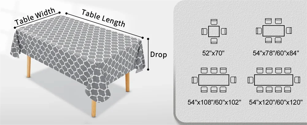 Kitinjoy rectangle table cloth 60x84 inches (152x213cm) fits rectangular tables of sizes 36x60 inches (91x152cm) to 48x72 inches (122x183cm); 60x102 inches (152x259cm) fits rectangular tables of sizes 36x76 inches (91x193cm) to 48x92 inches (122x234cm); 60x120 inches (152x305cm) fits rectangular tables of sizes 36x94 inches (91x239cm) to 48x104 inches (122x264cm). A bigger table will require a bigger tablecloth. In order to buy a more suitable tablecloth, please take a few seconds to measure your table before purchase.