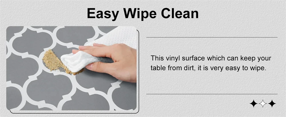 The 100% waterproof vinyl surface makes our tablecloths easier to clean and care for. Just wipe it gently with a damp cloth or sponge, you can get a new look. Warm Tips: Ironing temperature should not exceed 122° Fahrenheit.