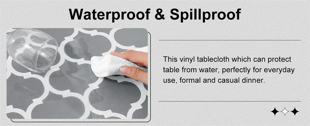 Kitinjoy vinyl tablecloth is more waterproof than the waterproof coating of farbic cloth. Don't worry about the splashing of drinks or soup, make your meals more enjoyable. It's perfect for families with children and pets.