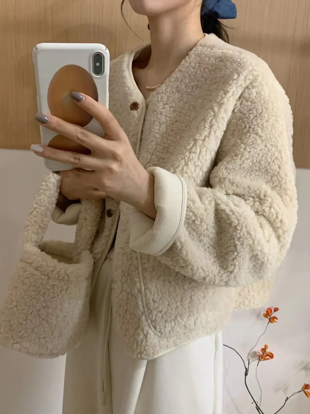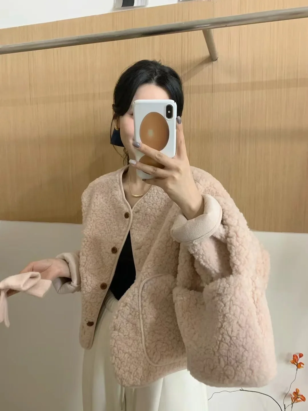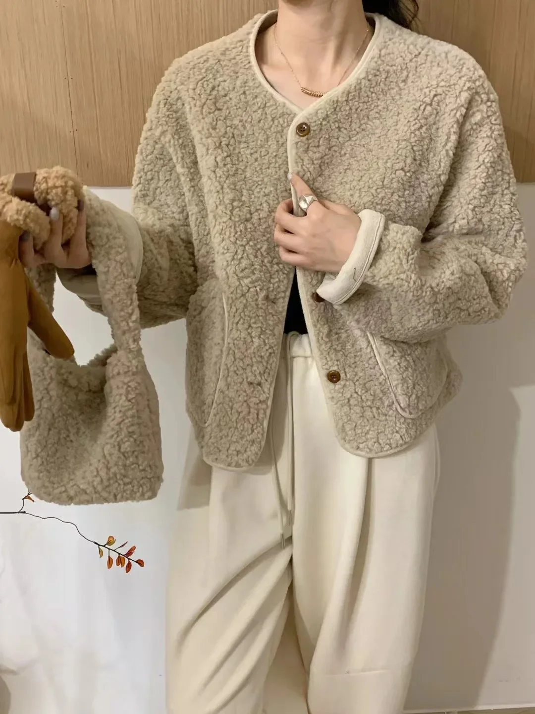 Korean Chic round Neck Single Button Loose Lamb Fur Jacket Winter Elegant Fashion Small Size with Bag Matching Women's Coat