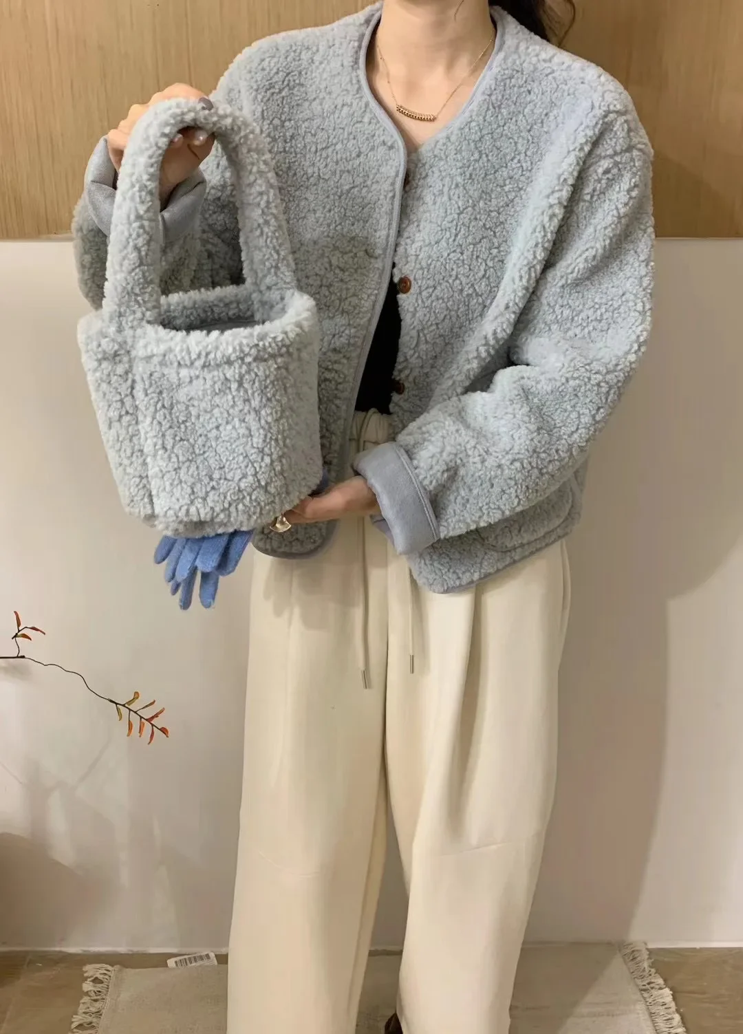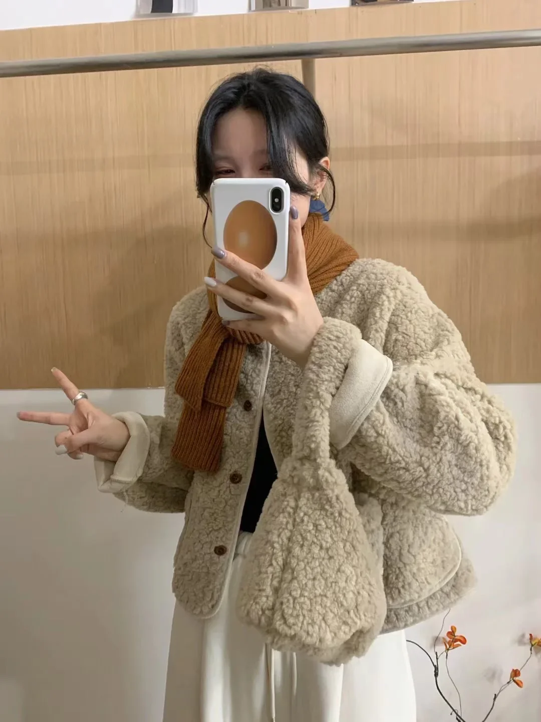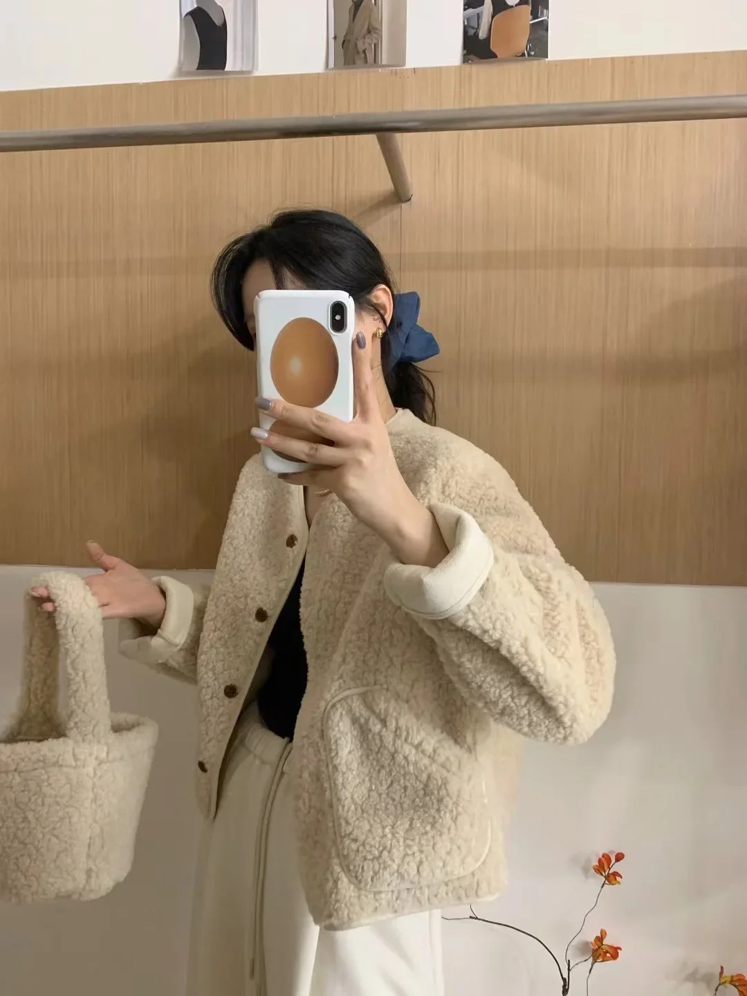 Korean Chic round Neck Single Button Loose Lamb Fur Jacket Winter Elegant Fashion Small Size with Bag Matching Women's Coat