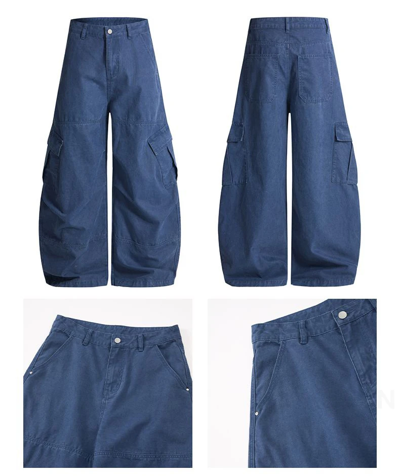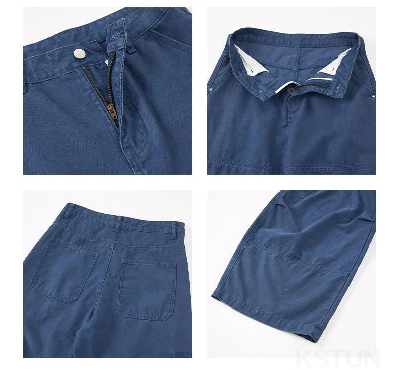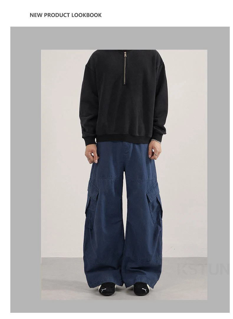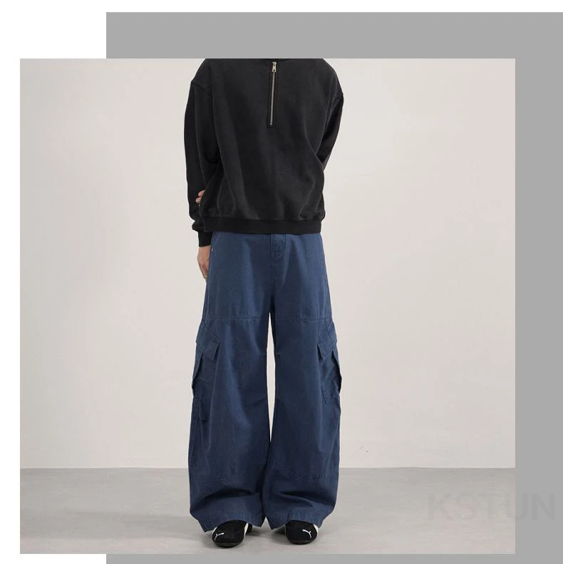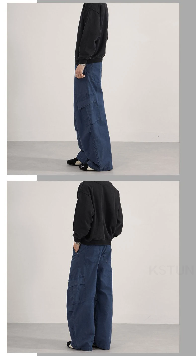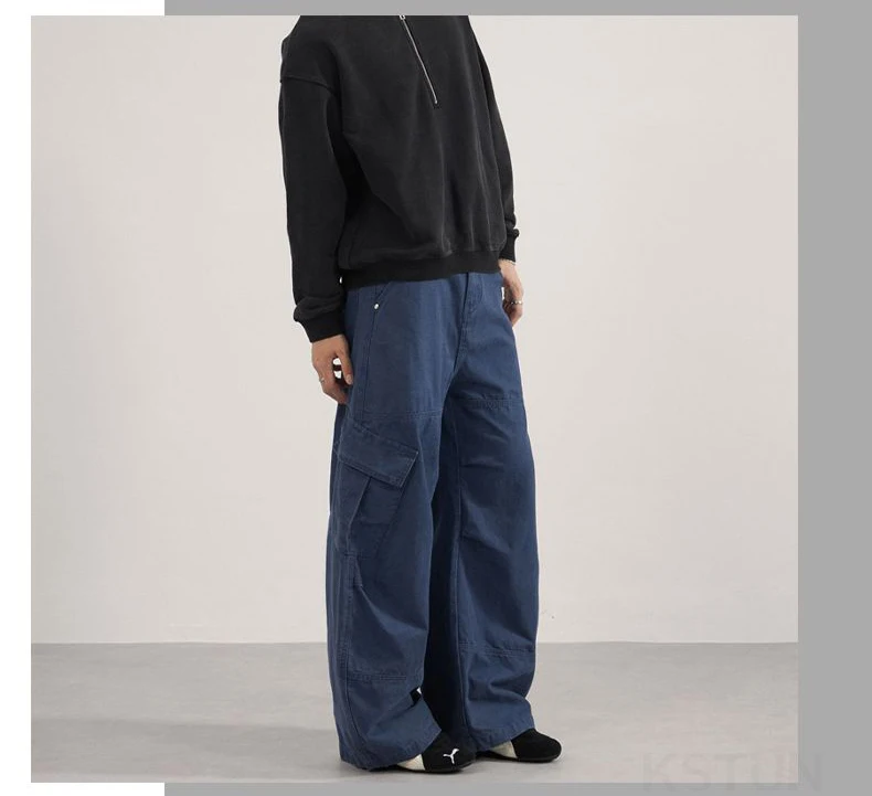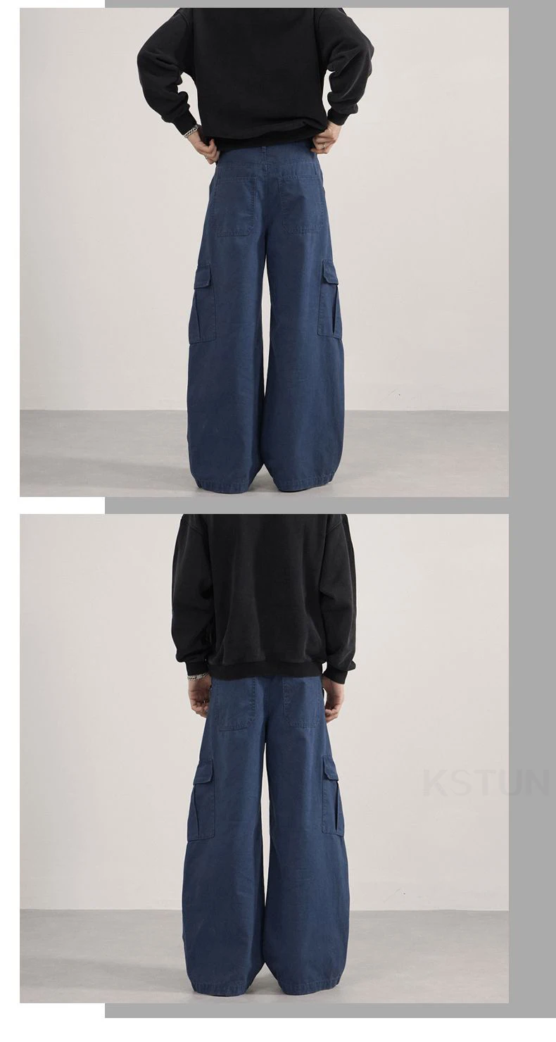 KSTUN 2025 Men Washed Vintage Cargo Pants 100% Cotton Loose Fit Oversize Multi-Pockets Trousers Blue Male Casual Scimitar Pants