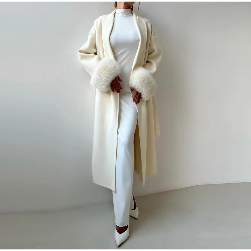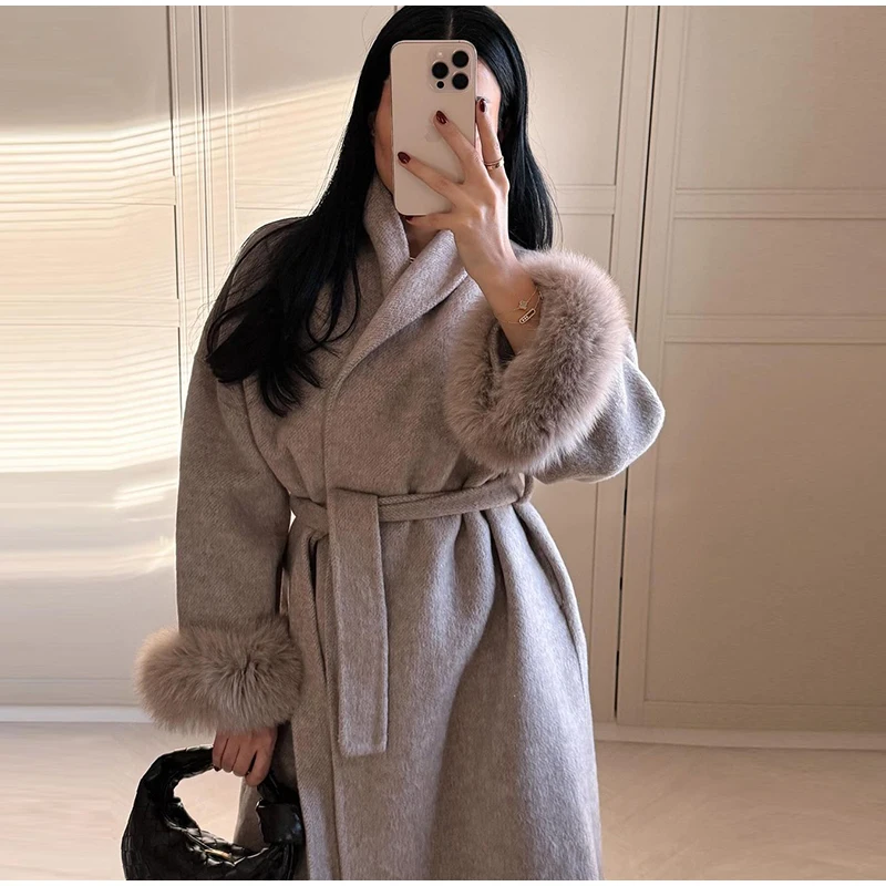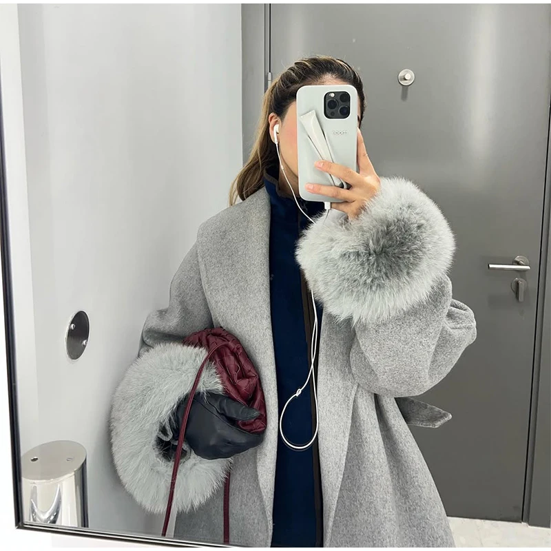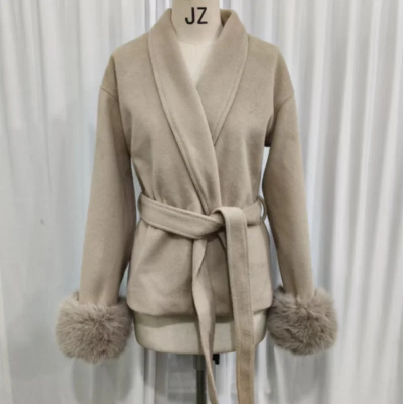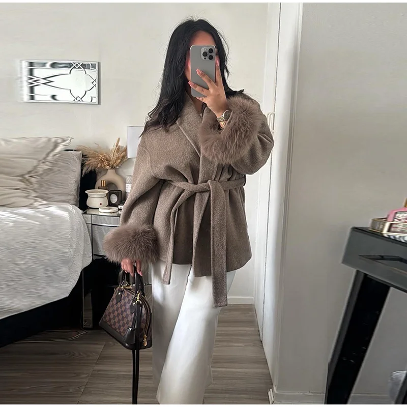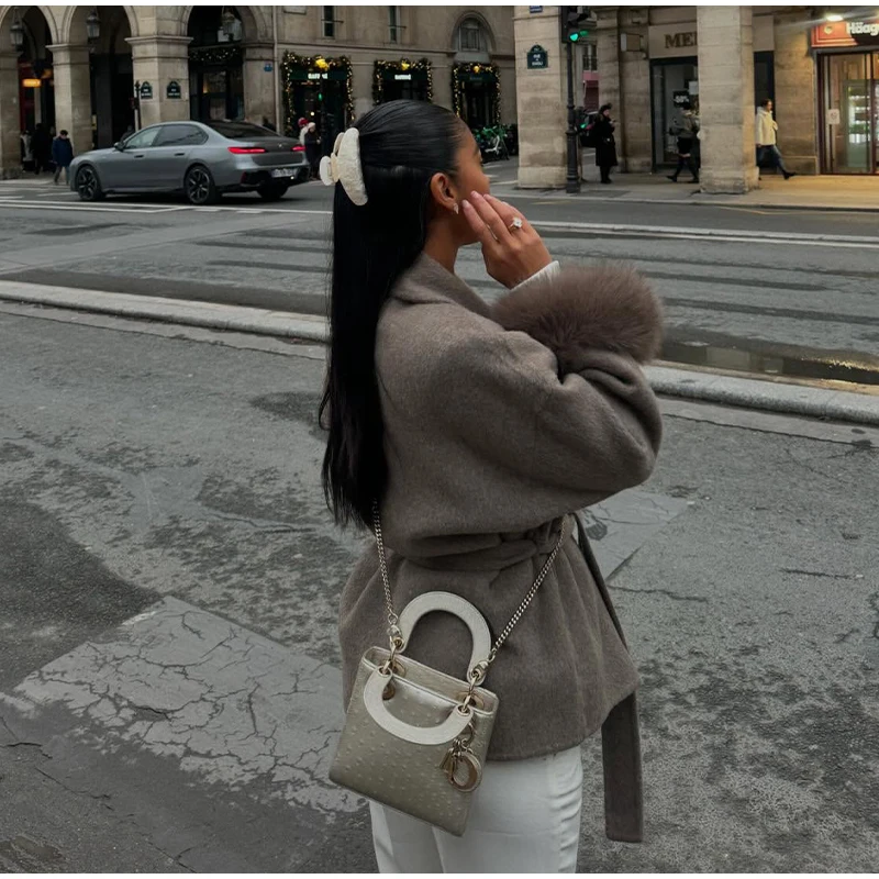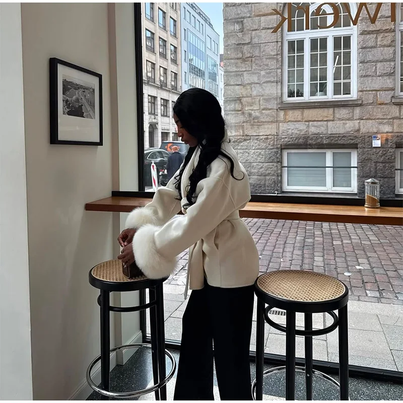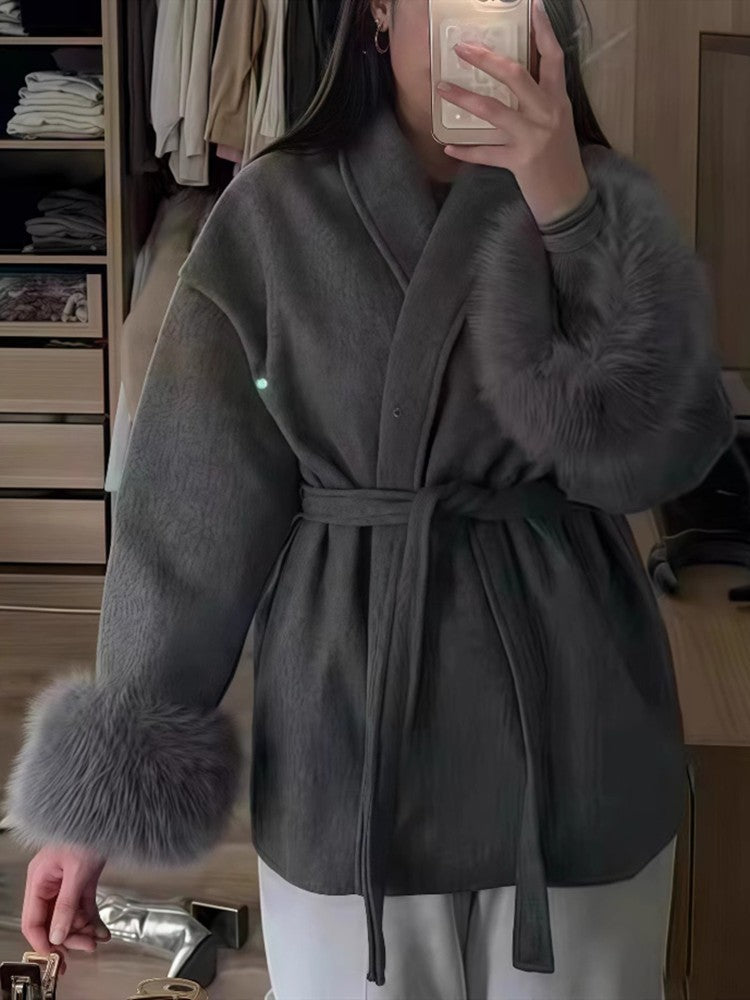 Lace-Up Short Overcoat Women's Coat Office Lady Elegant Woolen Furry Patchwork Long Sleeve Coats 2025 New Loose Cardigan Jackets