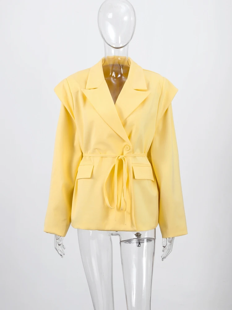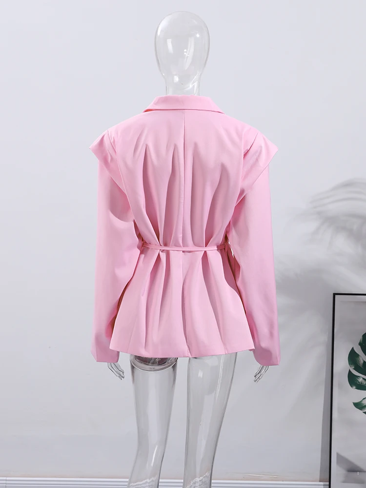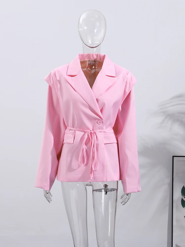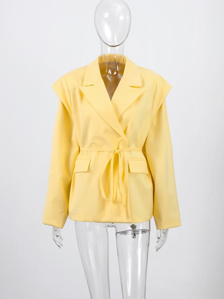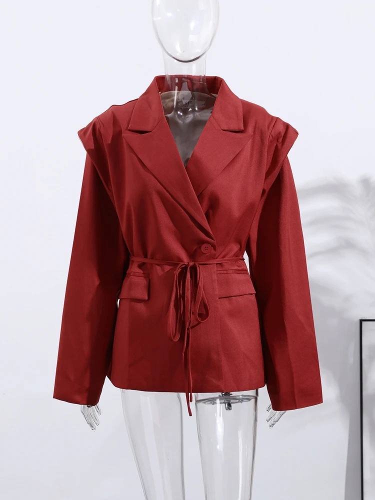Lace Up Shoulder Pad Blazer Coat Women Elegant Turn-down Collar Long Sleeve Pockets Slim Fit Coats Chic Ladies Commute Outerwear