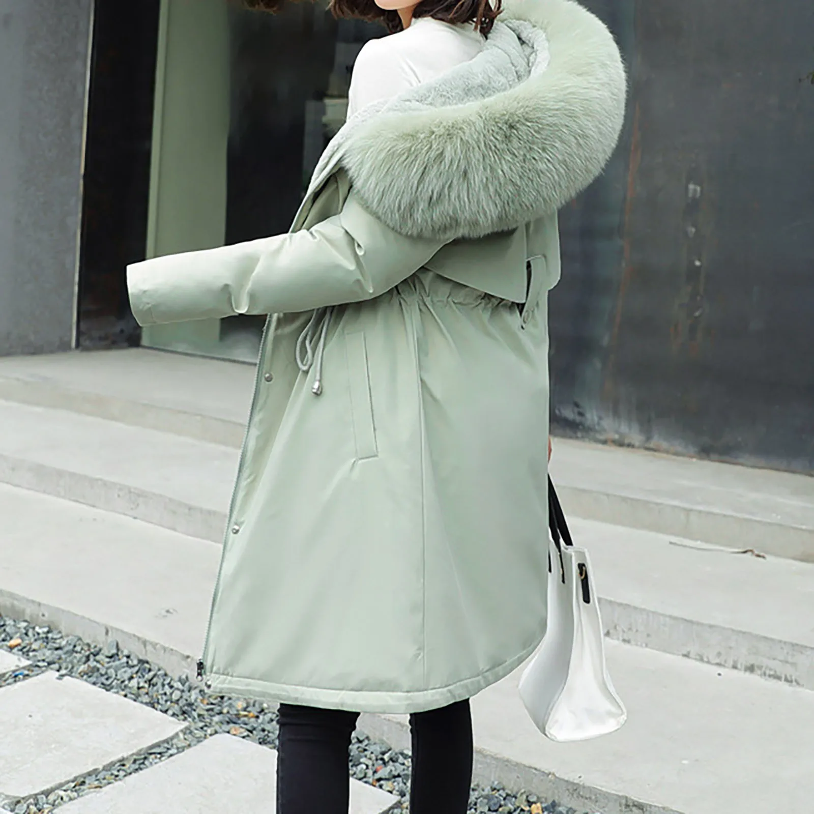 Ladies' Casual Warm And Versatile Large Fur Collar Solid Color Thick Cotton Coat Jacket For Outdoor Daily Wear