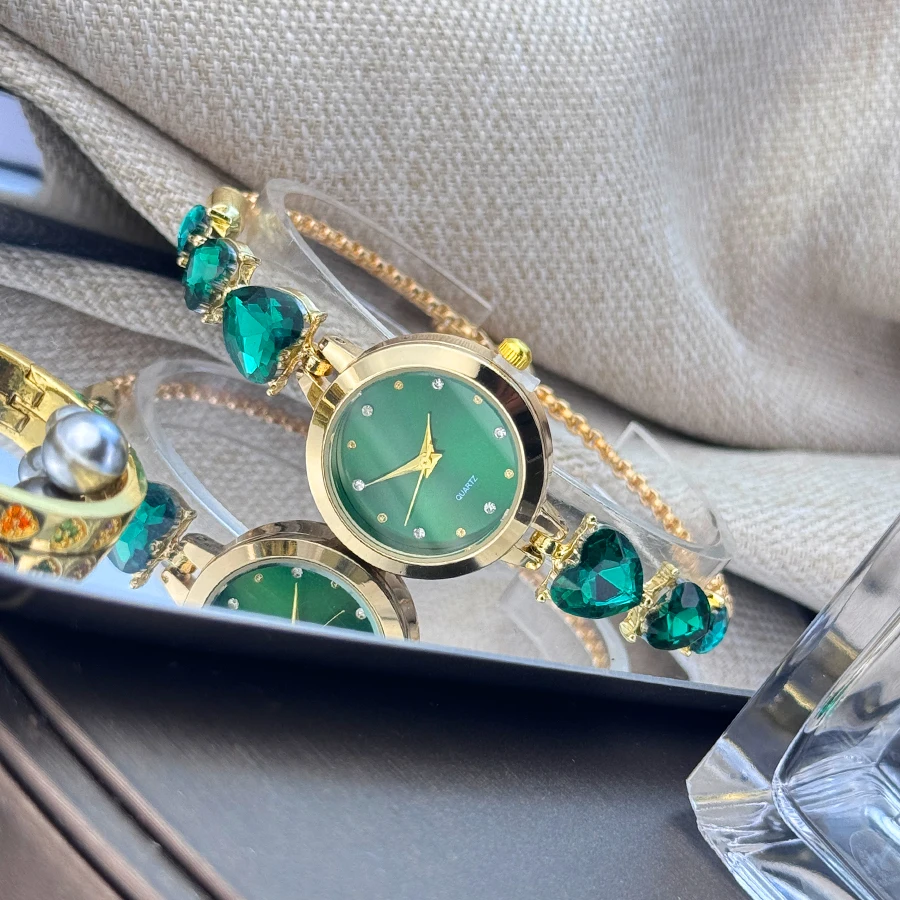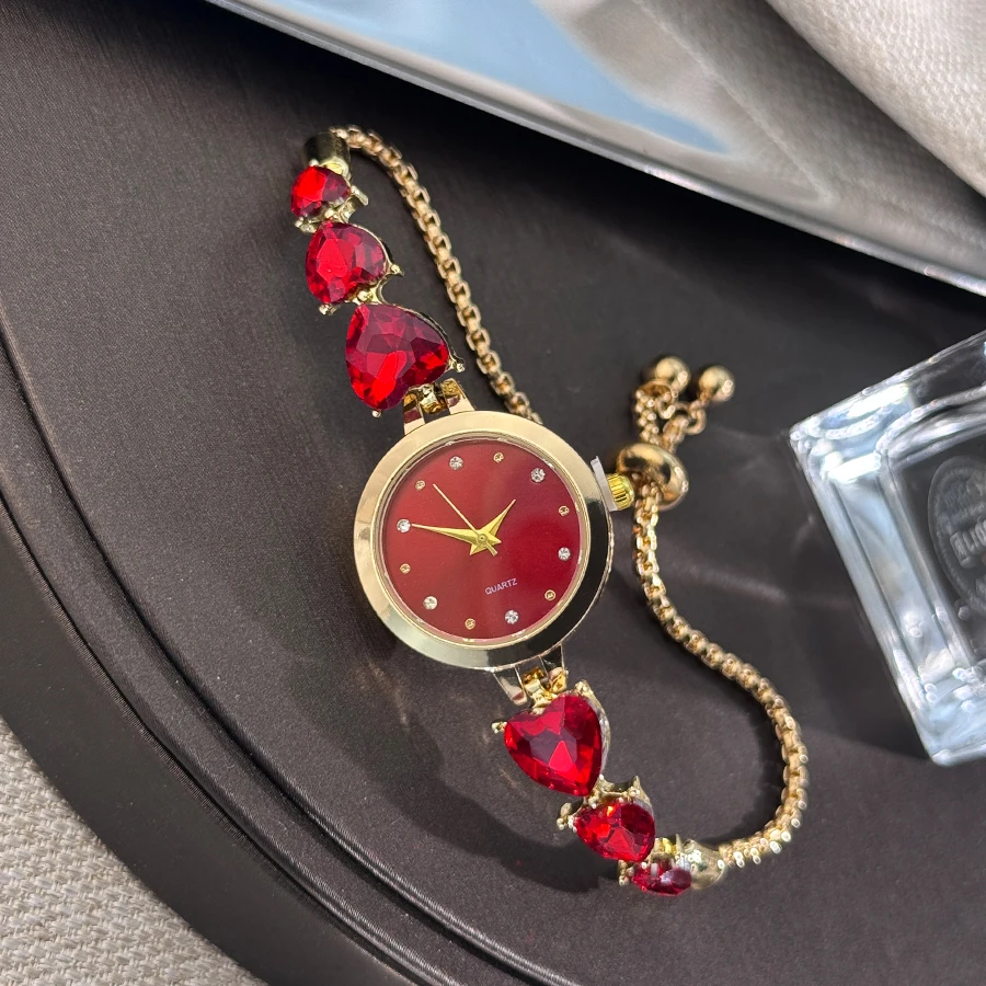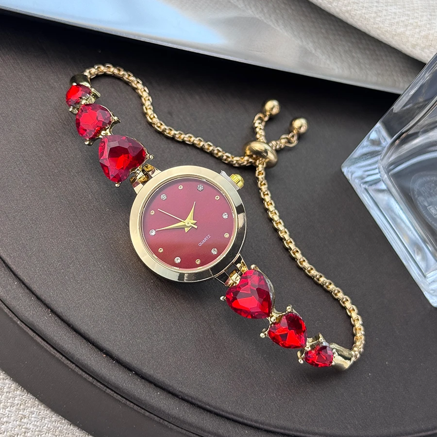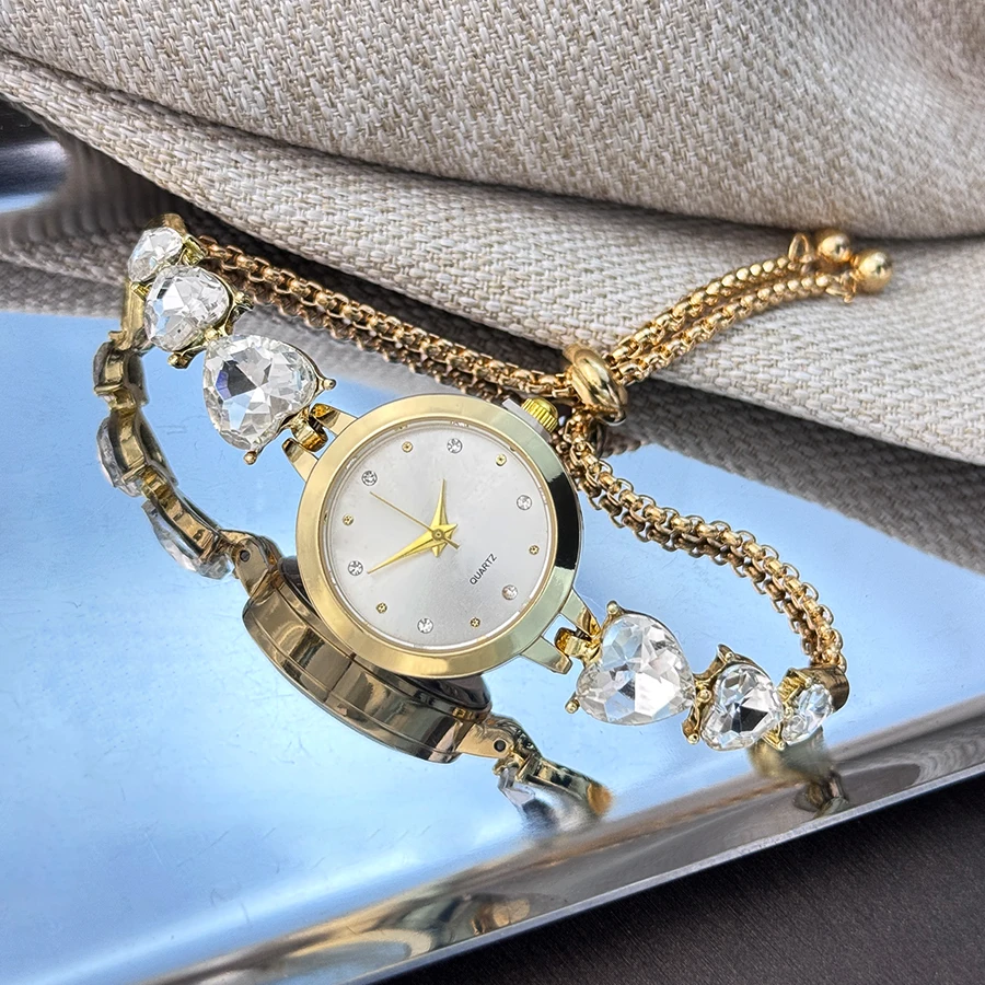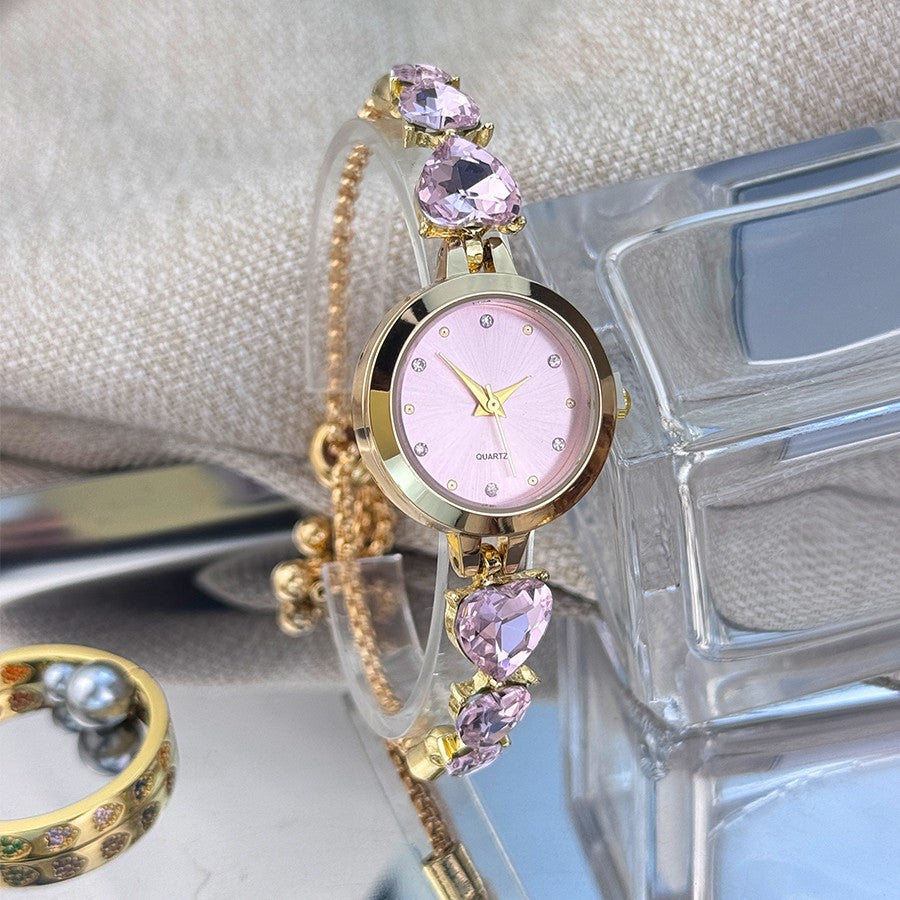 Ladies' quartz watch with three heart-shaped diamond-encrusted bracelet round alloy case and mixed scale simple light luxury