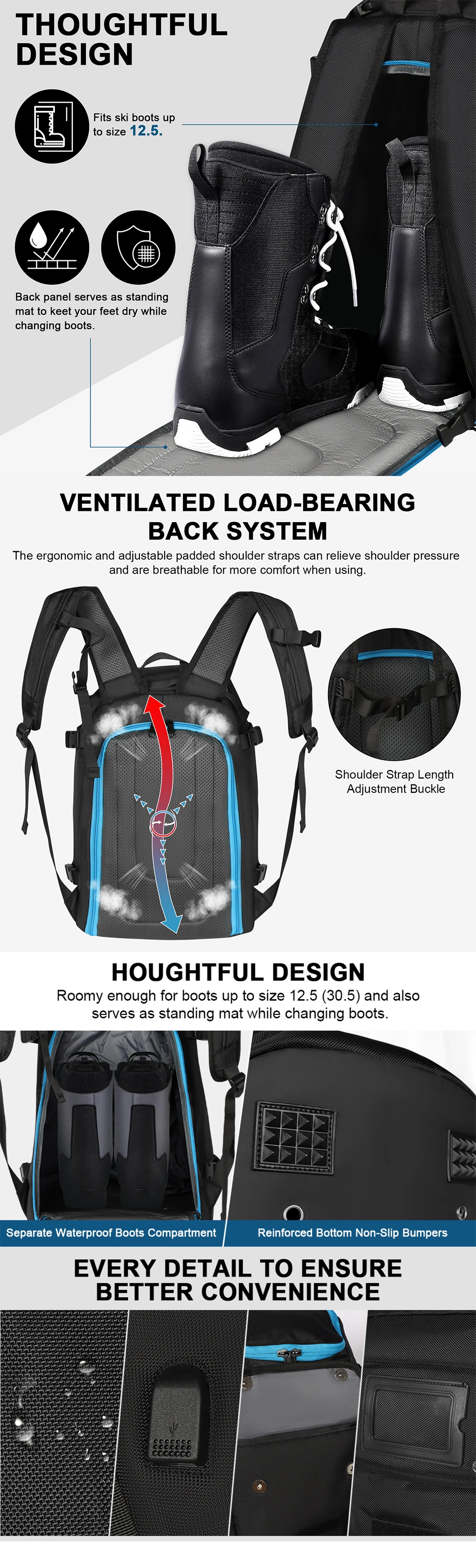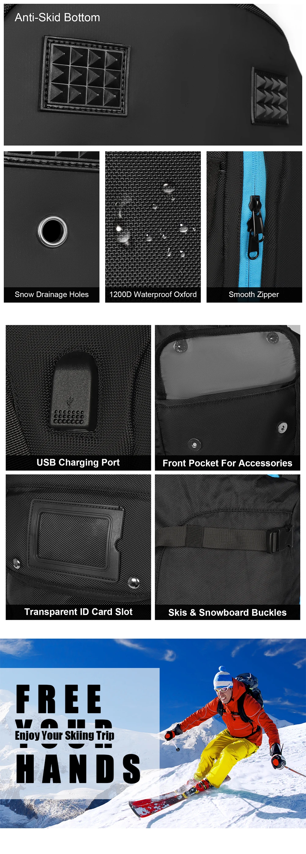 ●【MULTIFUNCTIONAL DESIGN】The ski travel bag features an EVA padded mesh back panelcan prevent the boots from jabbing. The adjustable chest buckle can be moved up and down to adjust to the position that suits you. Smooth double zipper large opening for easy access to items. It is also designed with a USB charging port and a transparent ID card slot to free your hands. The reflective strip on the front also increases visibility and safety at night or when there is fog.