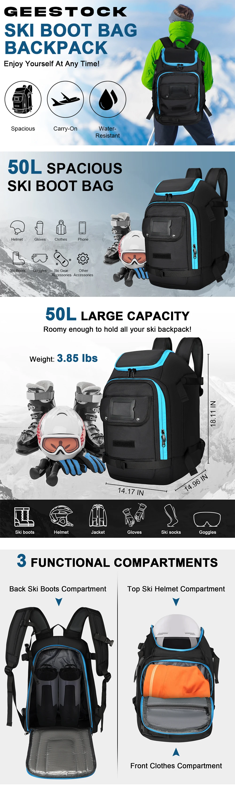 50L large capacity ski boot bag, roomy enough to hold all your ski gear. Keep everything organized, designed for ski traveler.