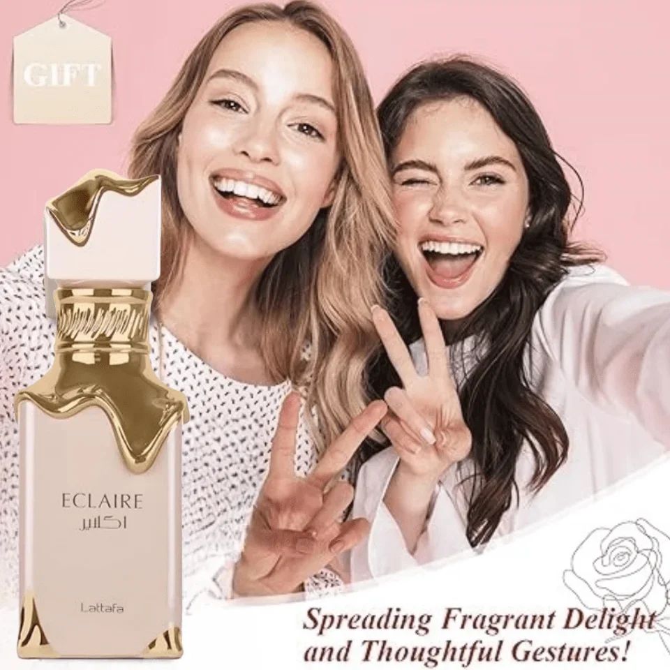 • Eclaire EDP Spray 100ML By Lattafa The fragrance opens with the top notes of caramel, milk, and sugar captivate the senses with their rich and creamy sweetness, reminiscent of a decadent confection.