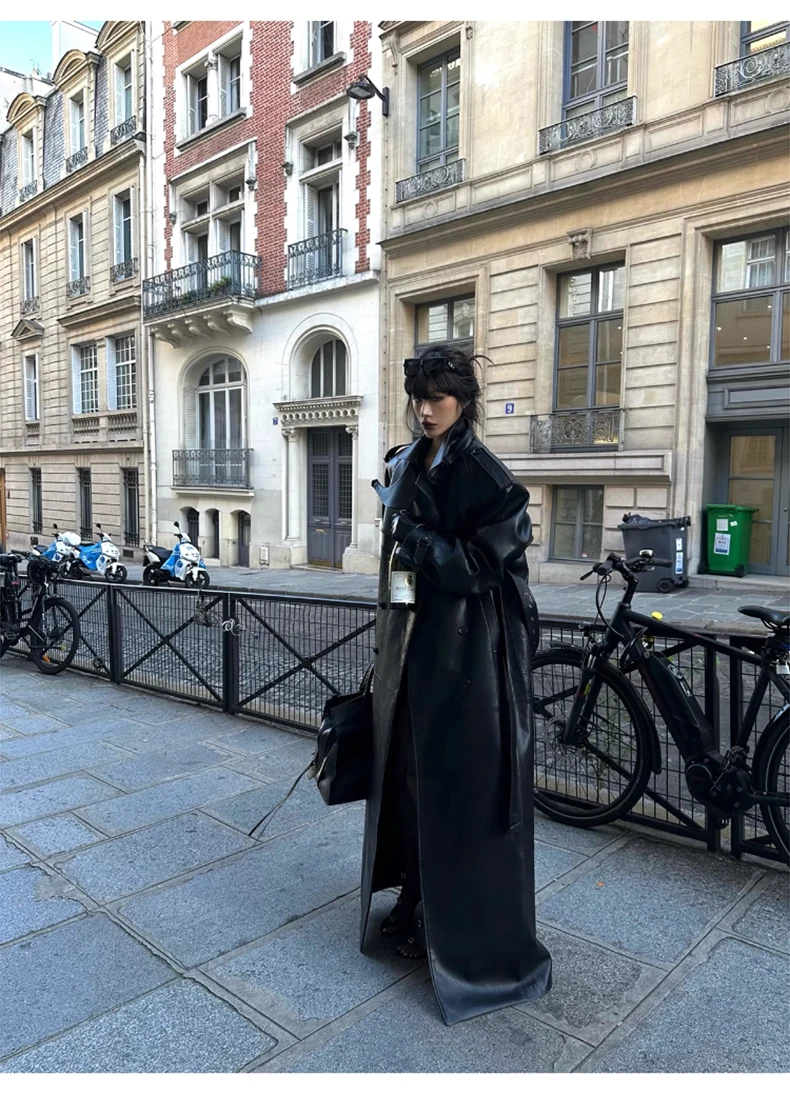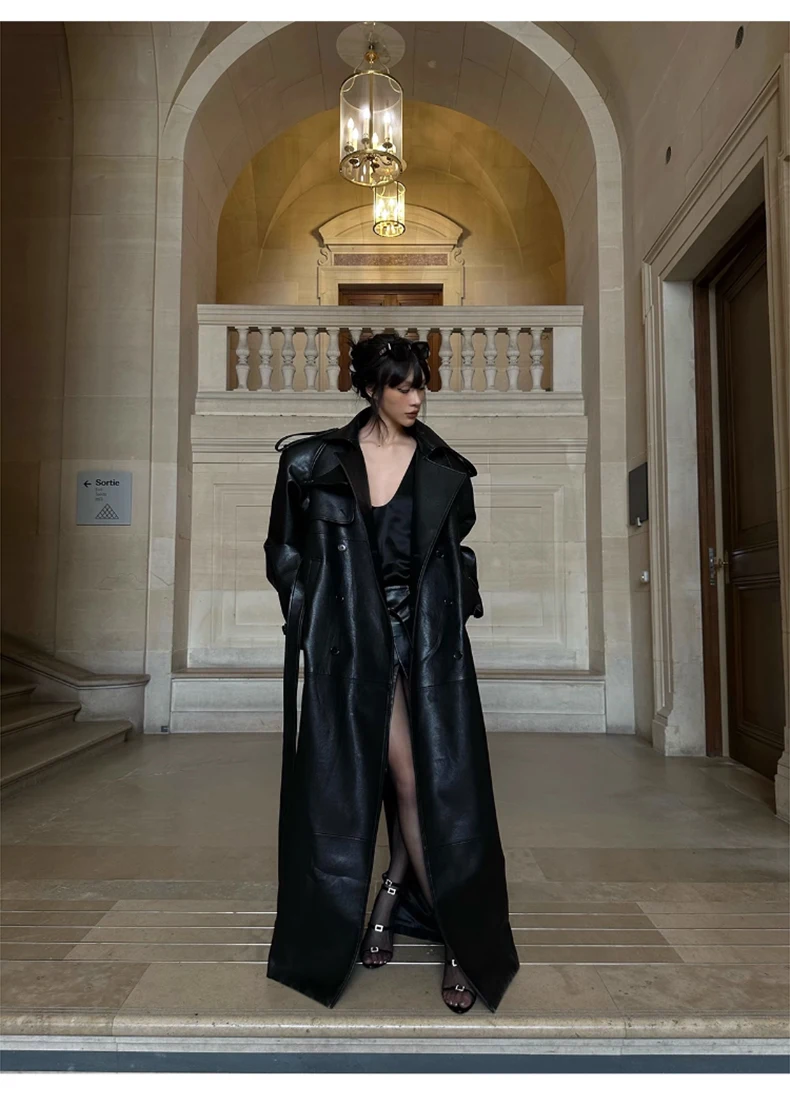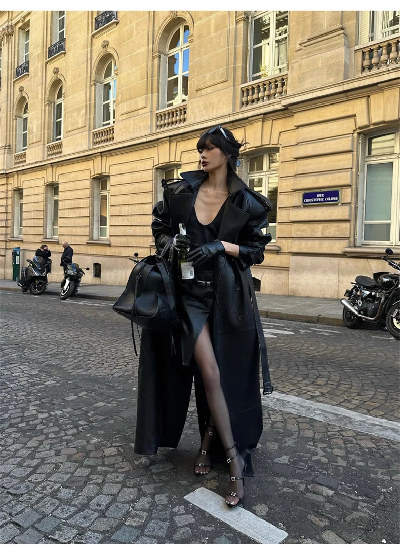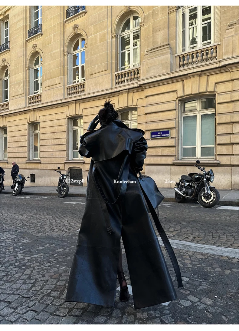 Lautaro Spring Autumn Extra Long Black Pu Leather Trench Coat for Women with Back High Slit Luxury Chic European Fashion 2024