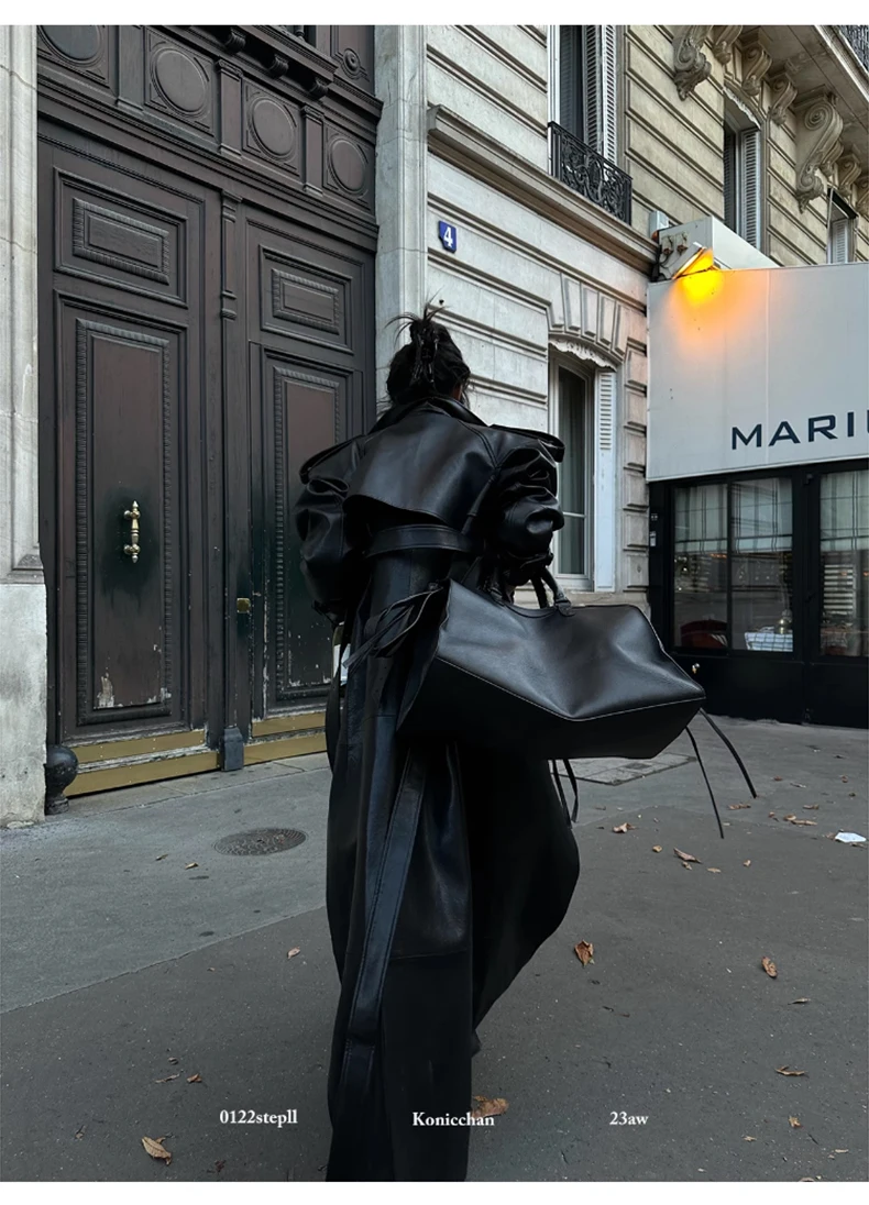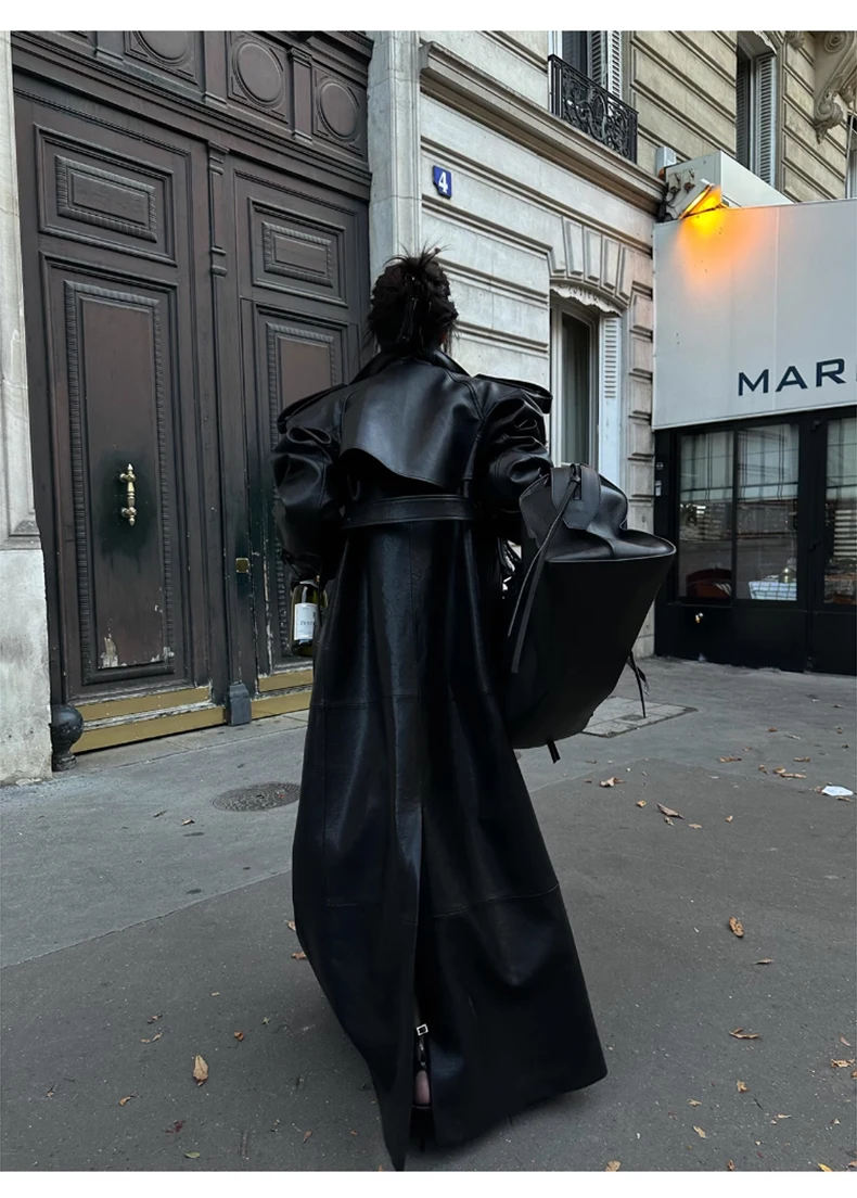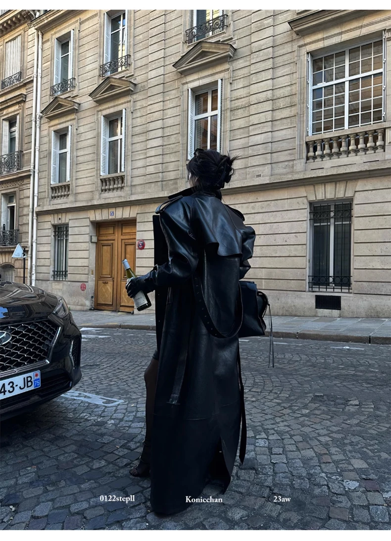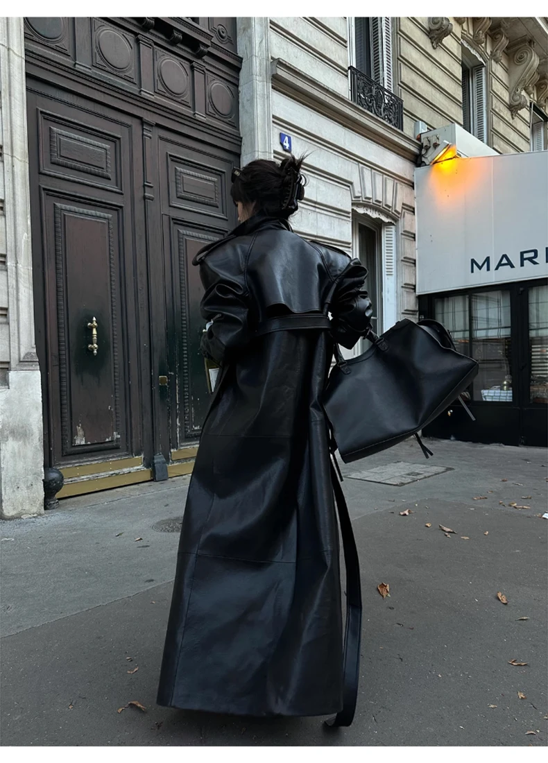 Lautaro Spring Autumn Extra Long Black Pu Leather Trench Coat for Women with Back High Slit Luxury Chic European Fashion 2024