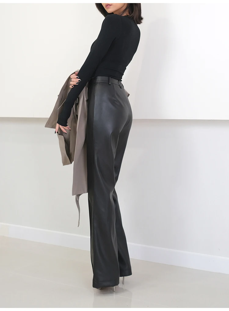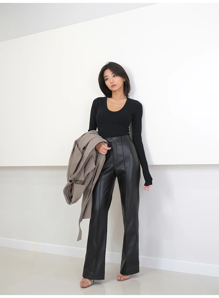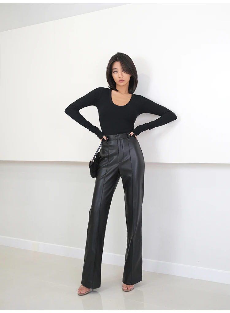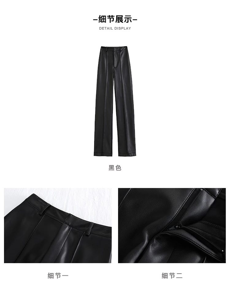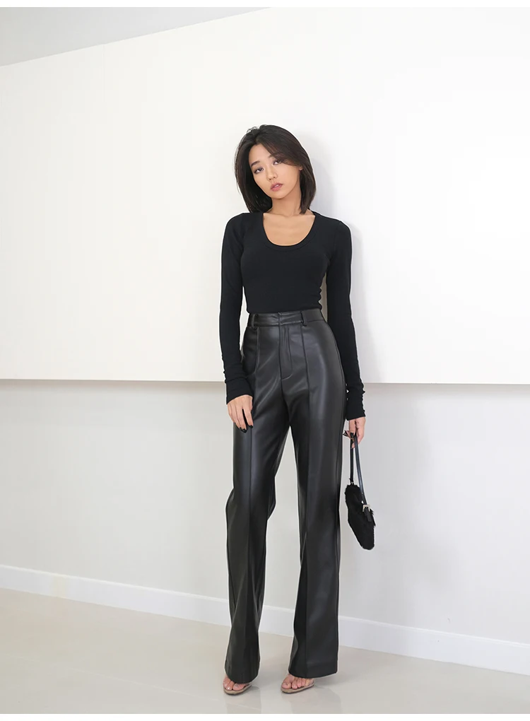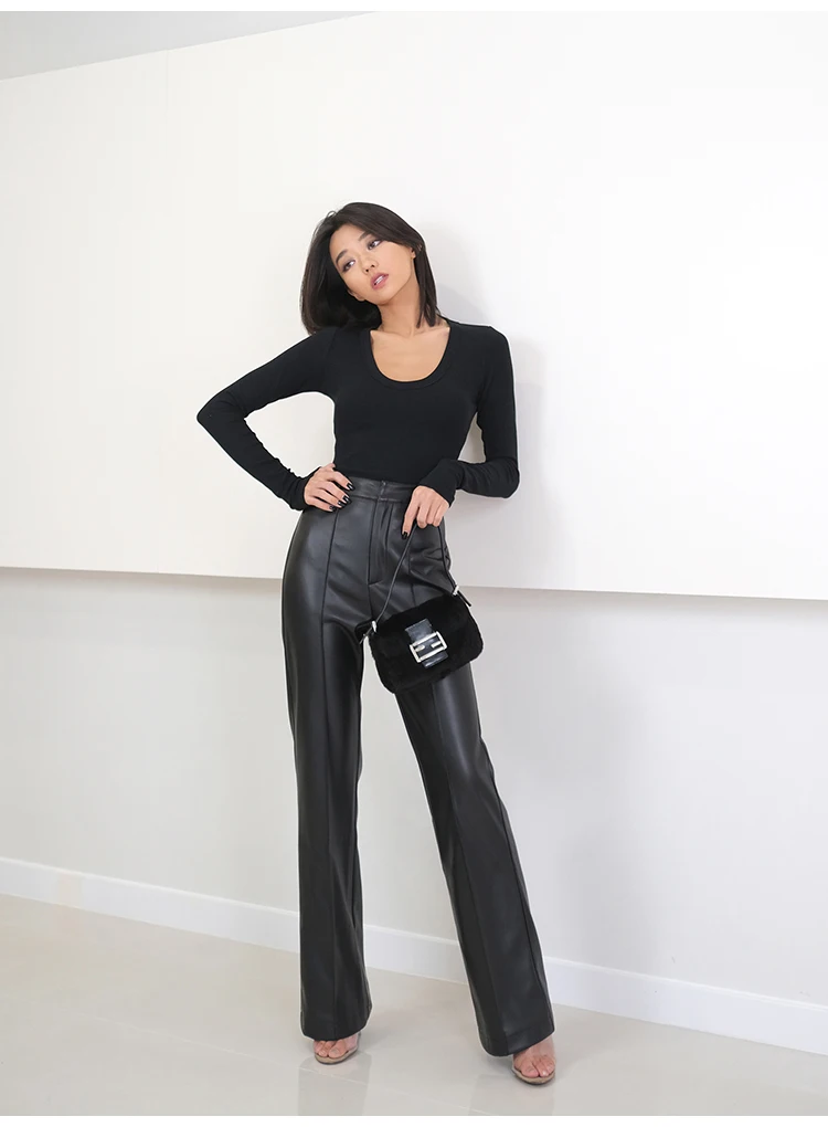 Lautaro Spring Autumn Long Black Soft Pu Leather Pants Women with Zipper High Waist Casual Elegant Straight Leg Trousers 2022