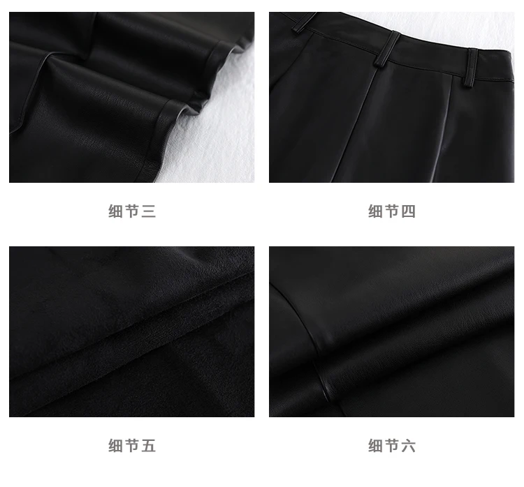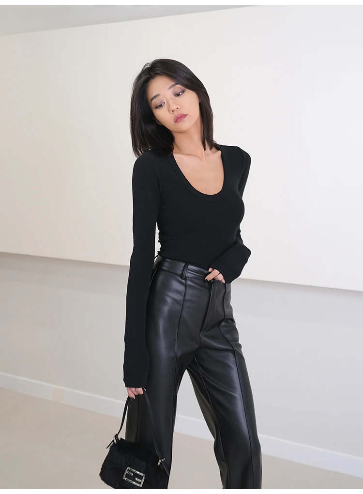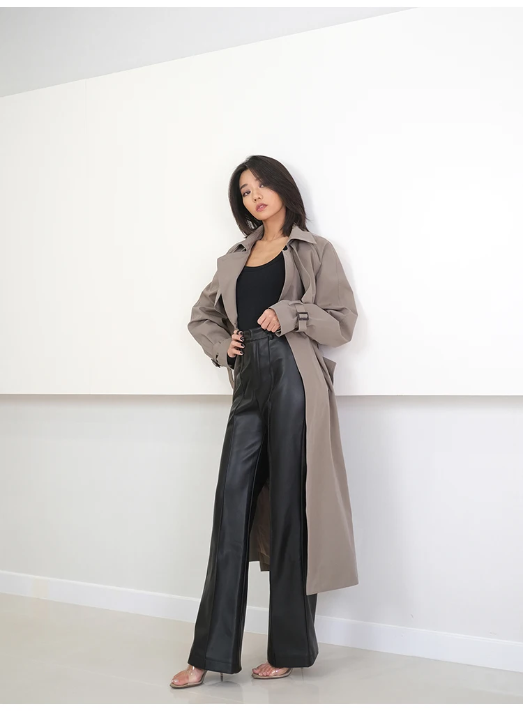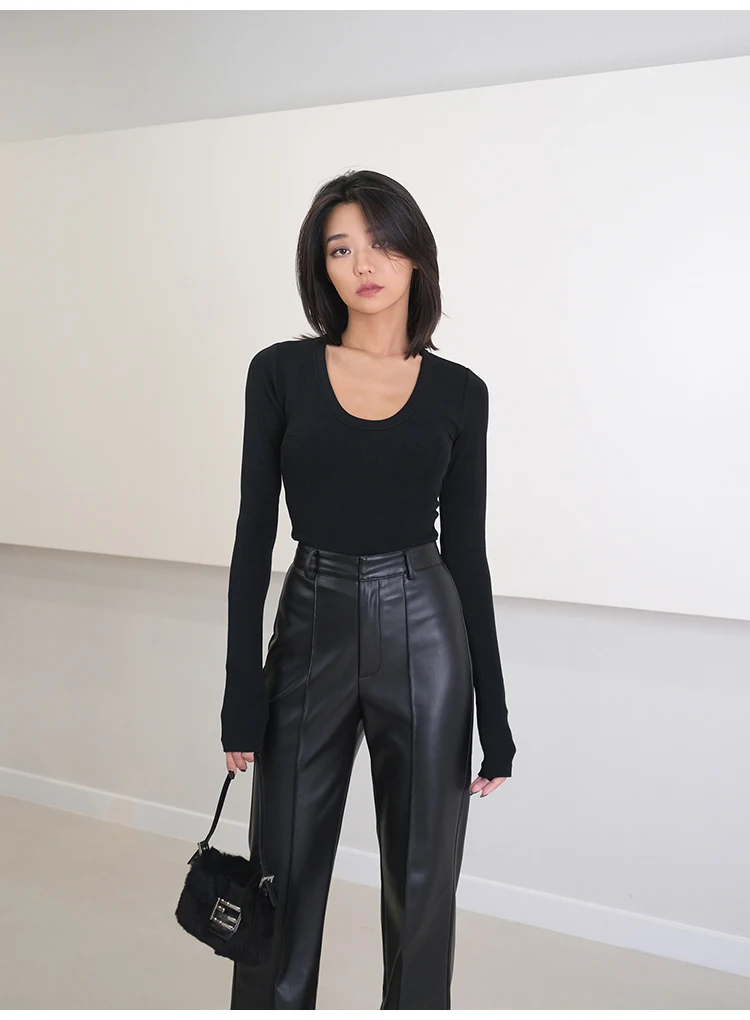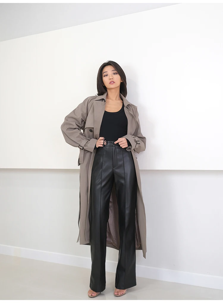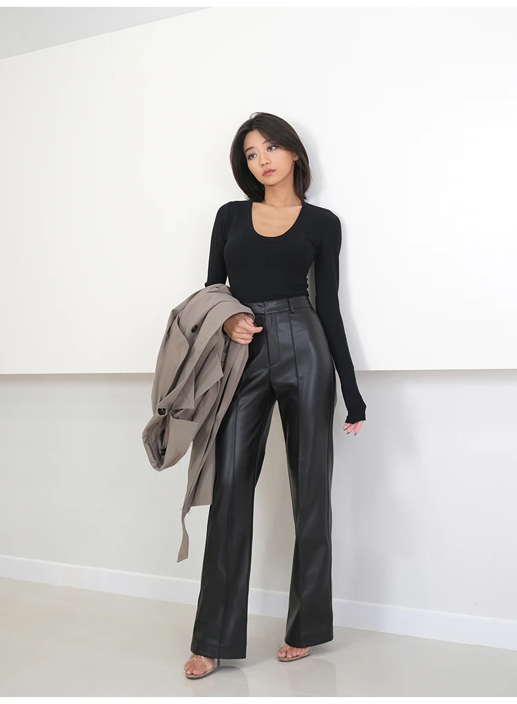 Lautaro Spring Autumn Long Black Soft Pu Leather Pants Women with Zipper High Waist Casual Elegant Straight Leg Trousers 2022