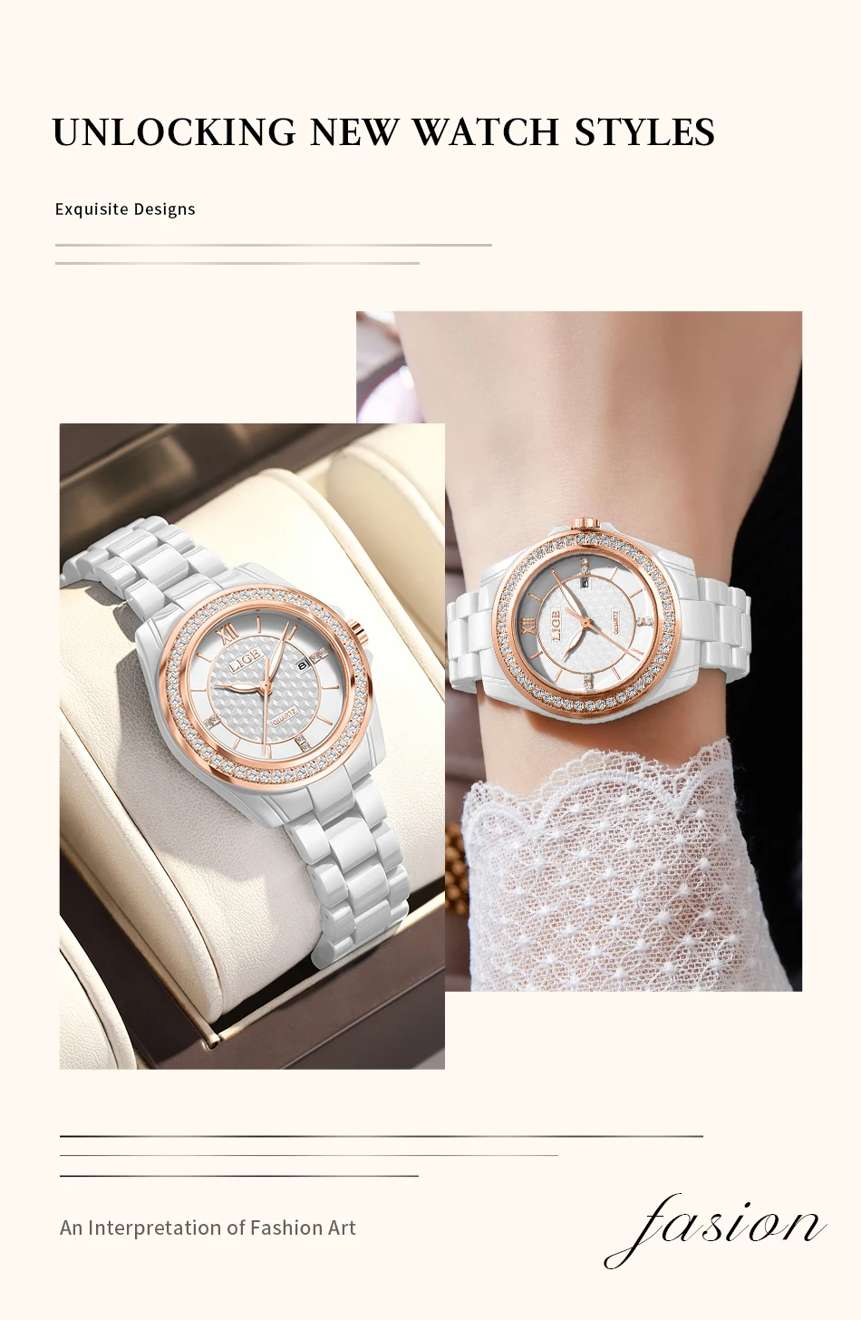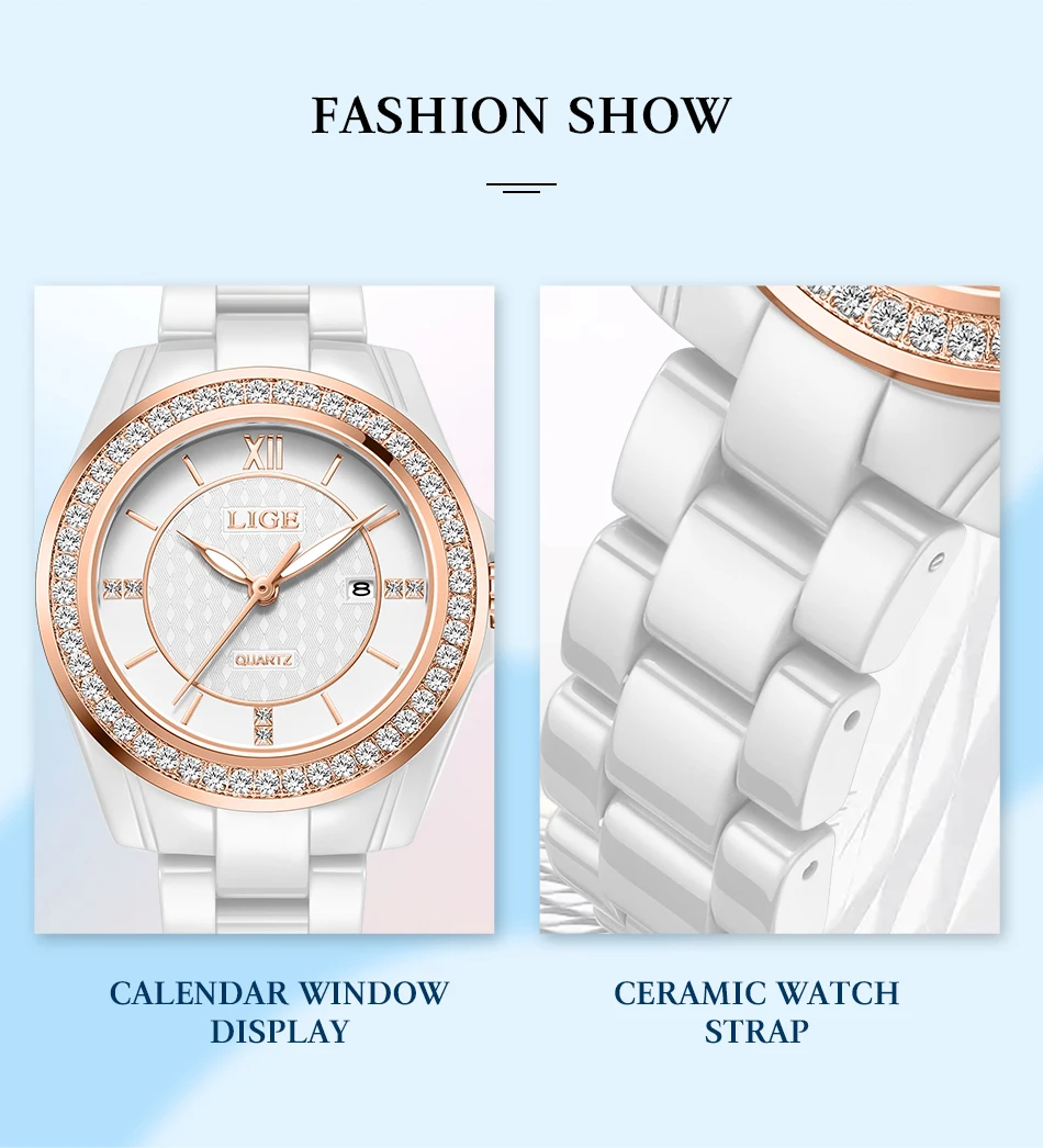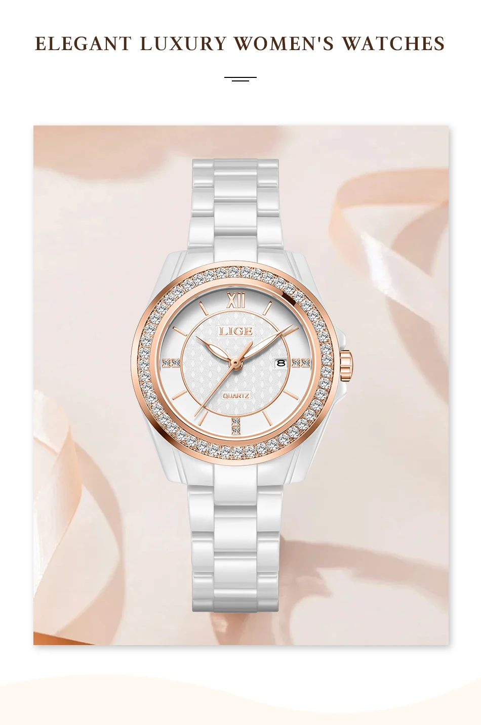 Core parameters of LIGE women's ceramic light luxury watch (white porcelain with diamonds)|Elegant and exquisite focus on the wrist