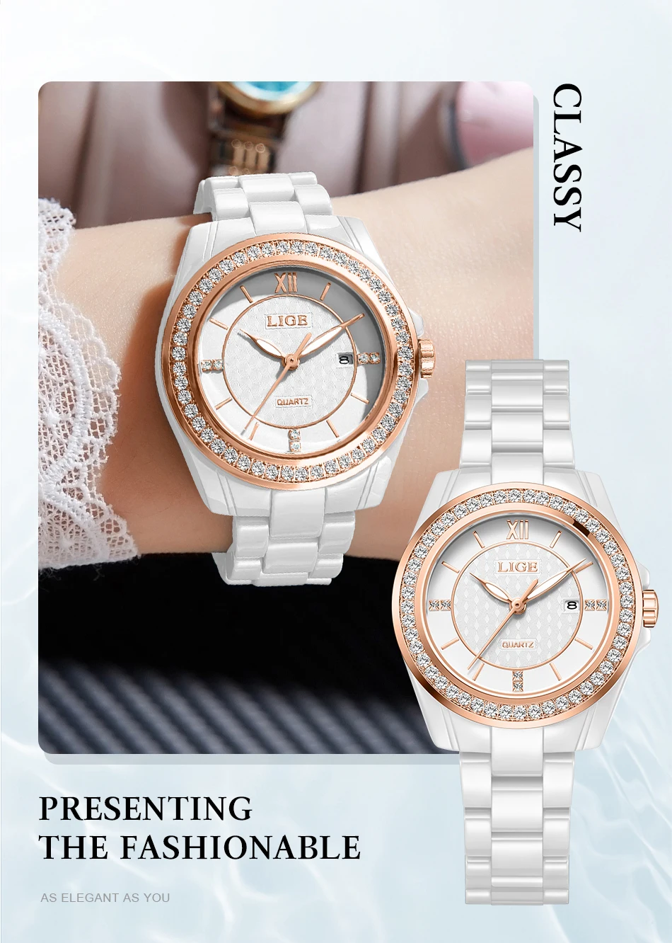 LIGE Fashion Quartz Watch for Women Stainless Steel Ceramics Strap Waterproof Women's Watches Elegant Luxury Ladies Wristwatch