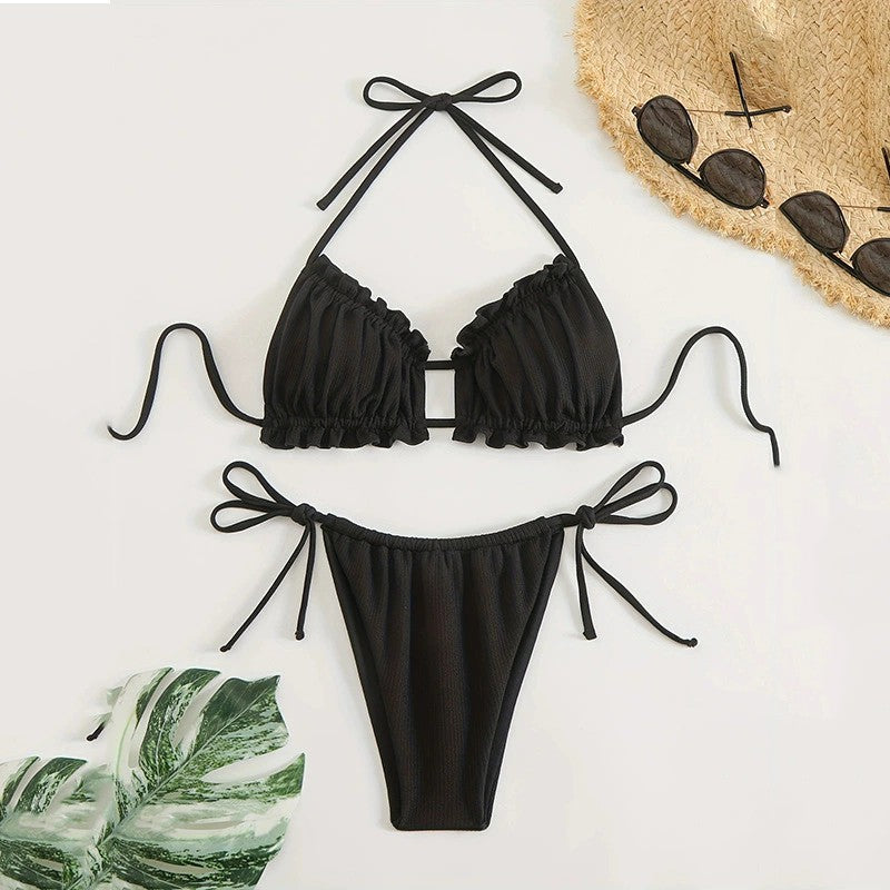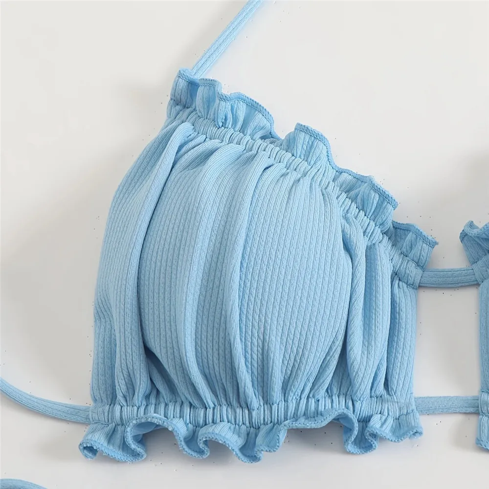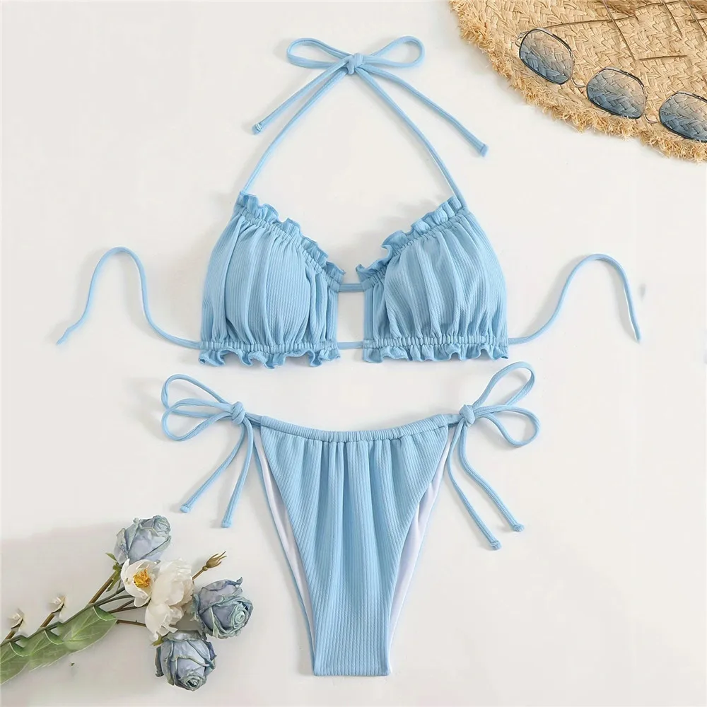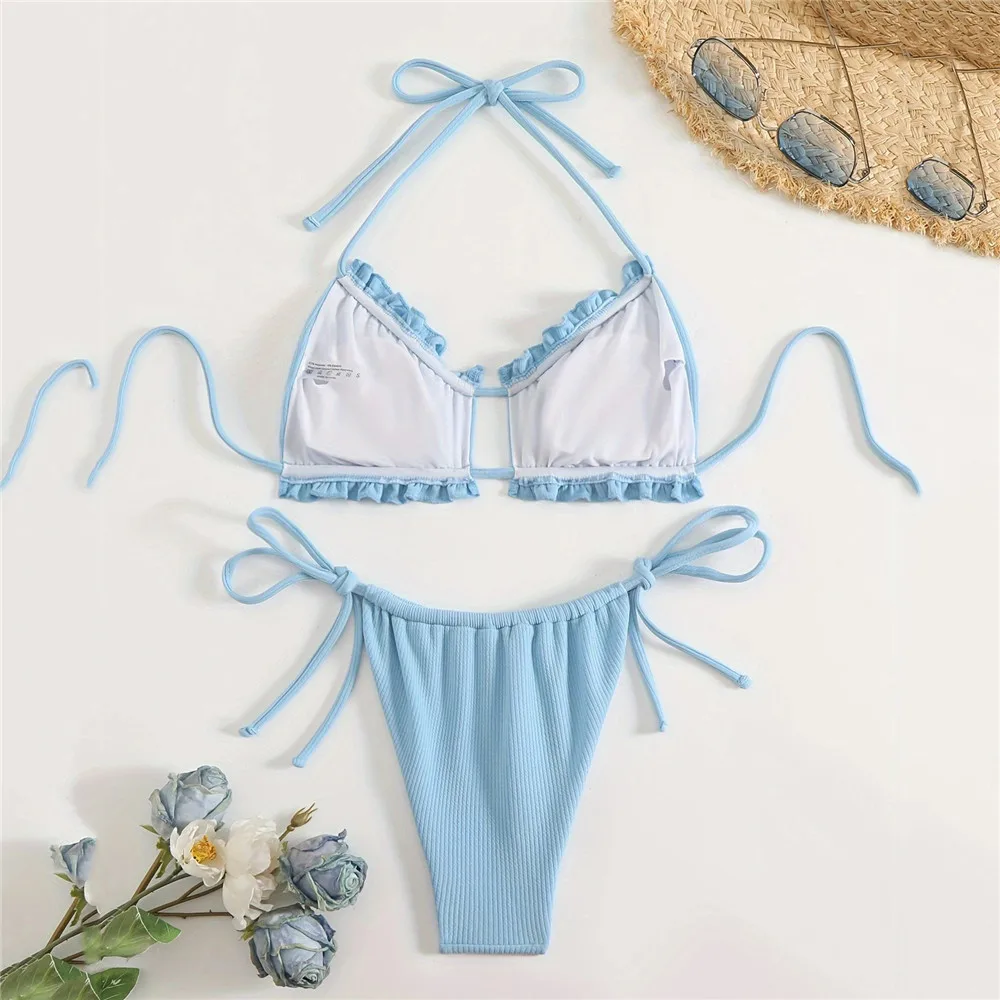 Light Blue Ribbed String Halter Swimwear Ruffled Bandeau Bikinis Sets Micro Thong Swimsuit Woman 2025 Bathing Suit Bikini Dames