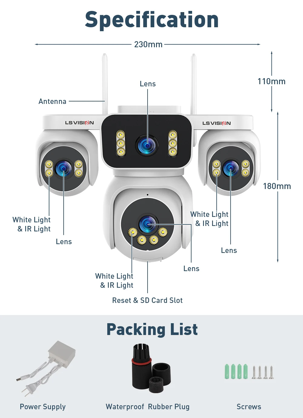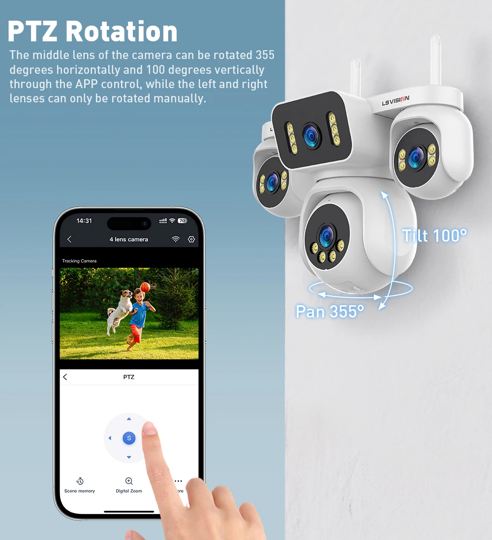 Four-lens system (4mm+4mm+4mm+6mm) enabling simultaneous four-screen monitoring, 355° horizontal and 90° vertical pan-tilt range, and manual 270° pan/90° tilt adjustment for targeted coverage. Delivers complete perimeter security with no dead zones, ideal for large areas like warehouses, parking lots, or homes. The multi-lens design eliminates the need for multiple cameras, reducing costs while ensuring every angle is monitored in HD clarity.
