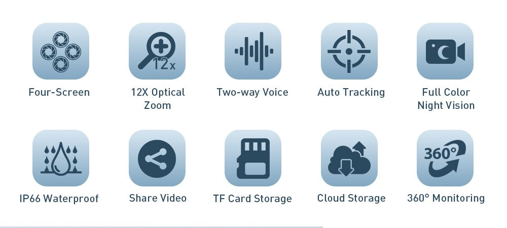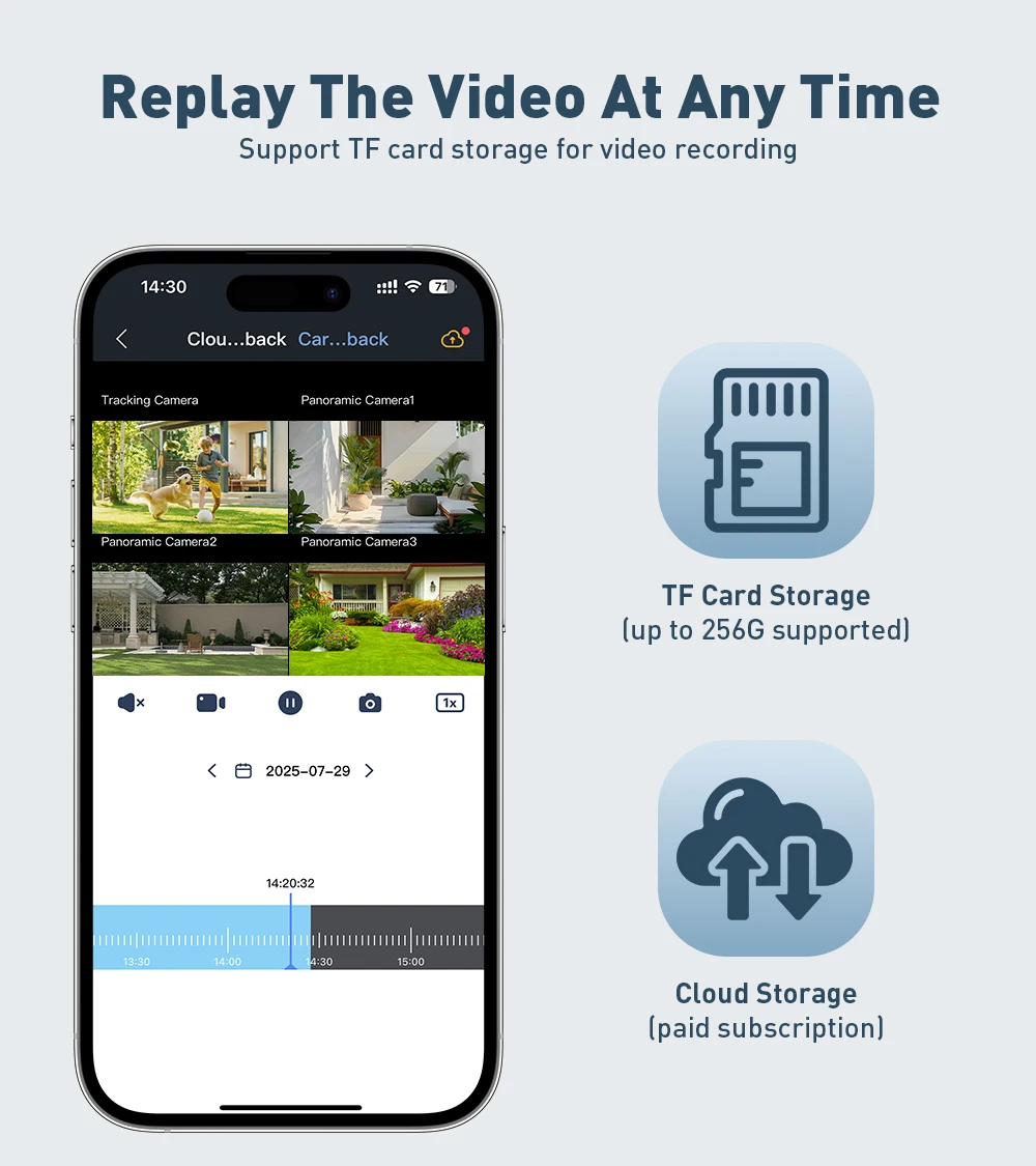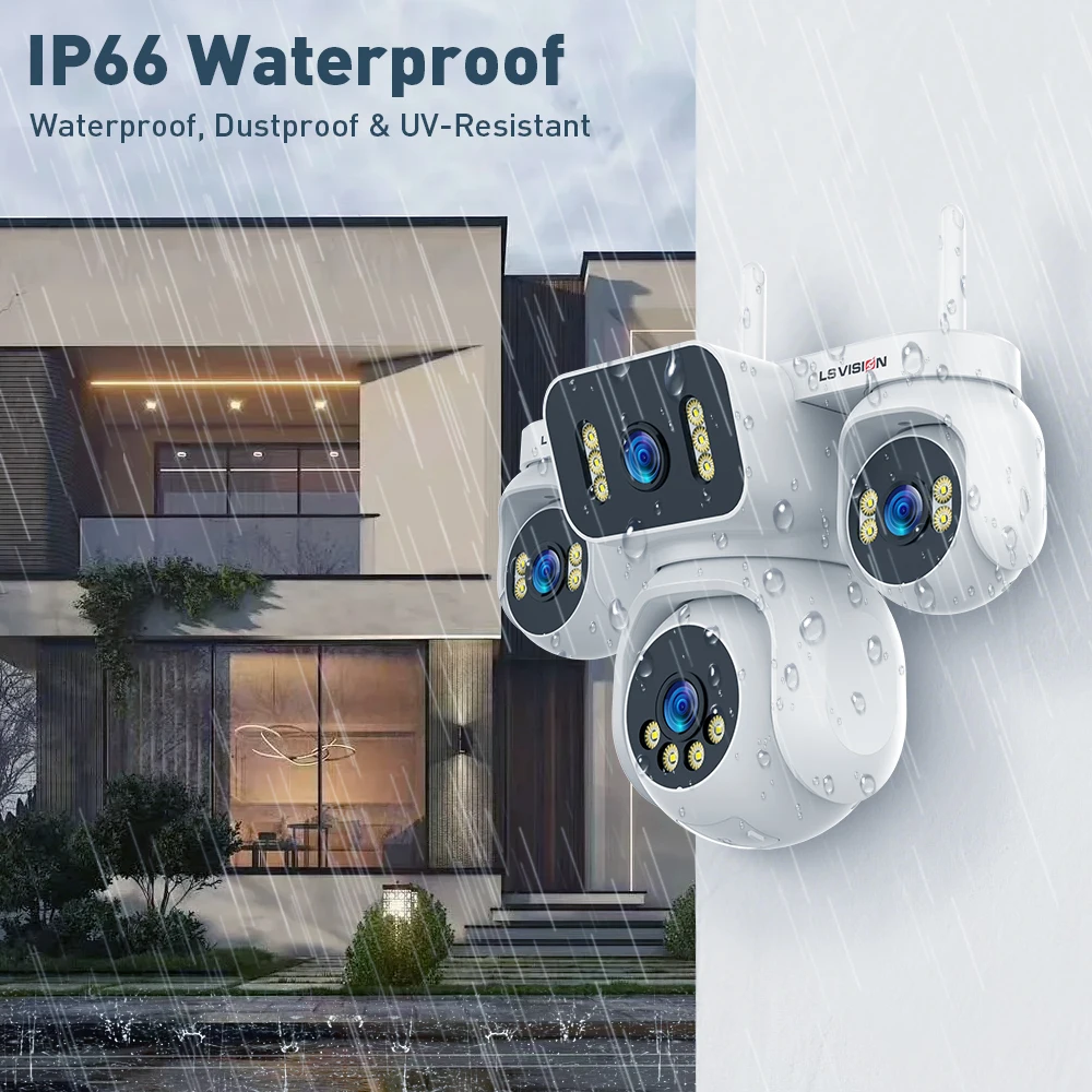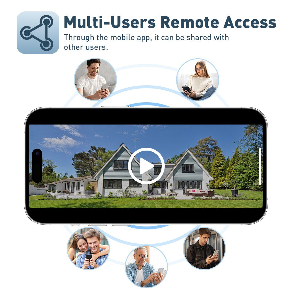 3. Smart Automation & Remote Control Ecosystem: Auto-tracking, motion/human detection alarms, two-way audio, 4-channel synced recording/playback, and Android/iOS app support with cloud/TF card storage (up to 256GB).  Transforms security into a proactive system—automatically follows intruders and sends real-time alerts to your phone. Remotely access live feeds, review footage, or communicate via the app from anywhere, backed by flexible storage options and IP66 weatherproof reliability for 24/7 operation.