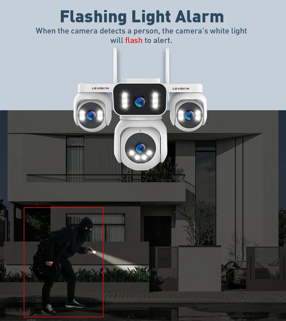 2. Intelligent HD Imaging with Adaptive Night Vision: 20MP ultra-HD resolution, 12X Optical zoom, dual-light source (infrared + white light), and customizable night vision modes (infrared or full-color). Captures razor-sharp details day or night, with AI-enhanced low-light performance. The dual-light system automatically switches to full-color night vision for vivid imagery in darkness, while motion detection and human-triggered alerts ensure critical events are never missed.