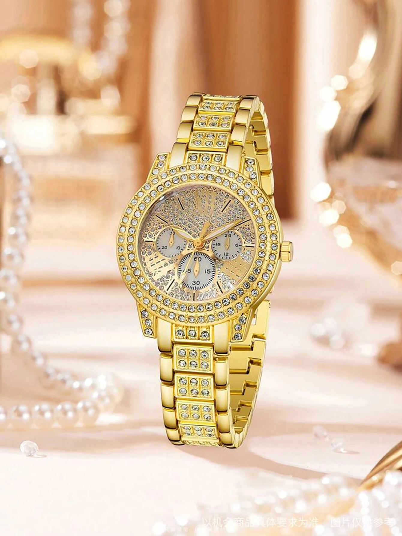 Luxurious ladies' quartz watch and jewelry set with intricate engravings, a birthday gift, and an elegant outfit for a party.