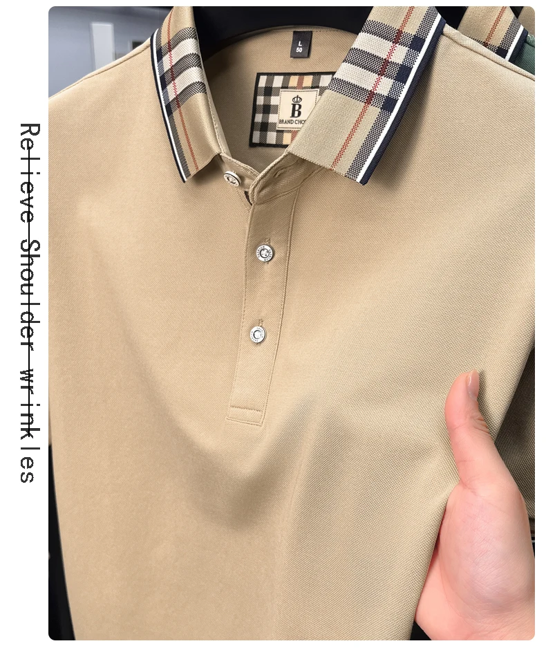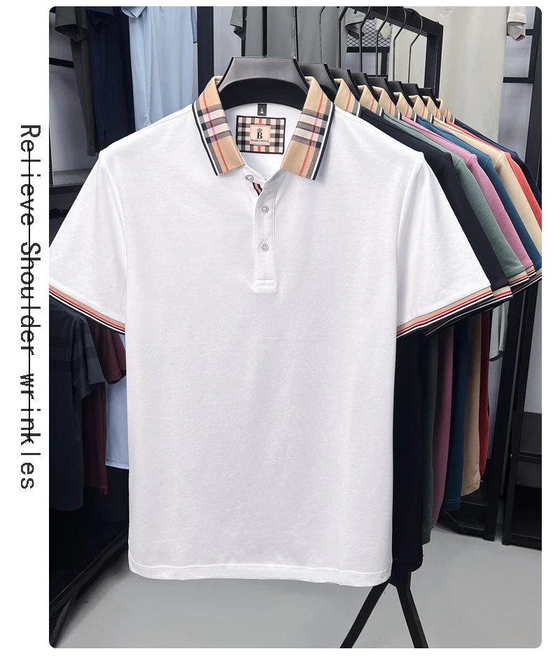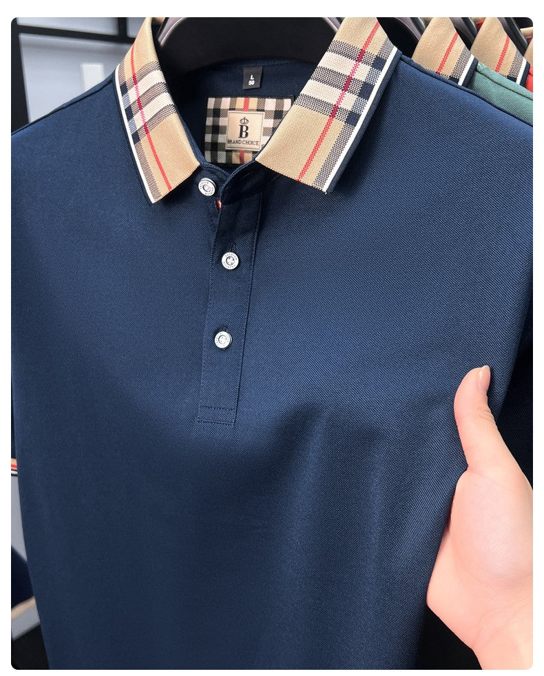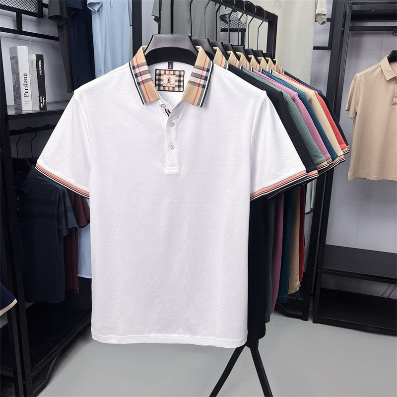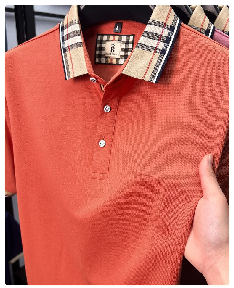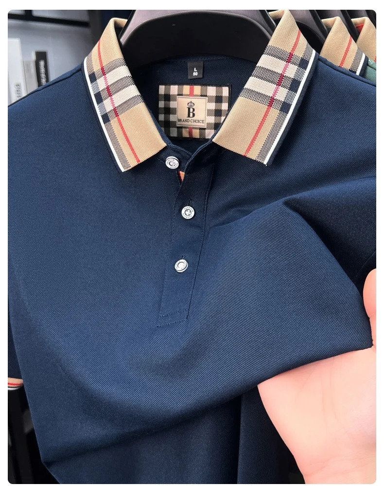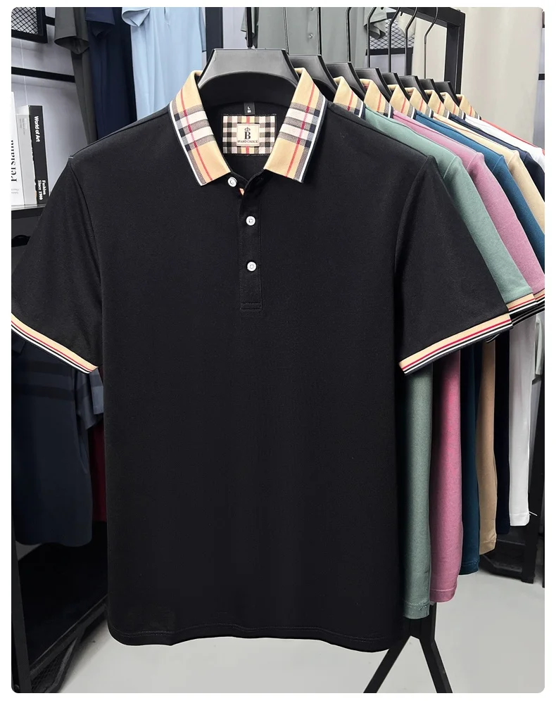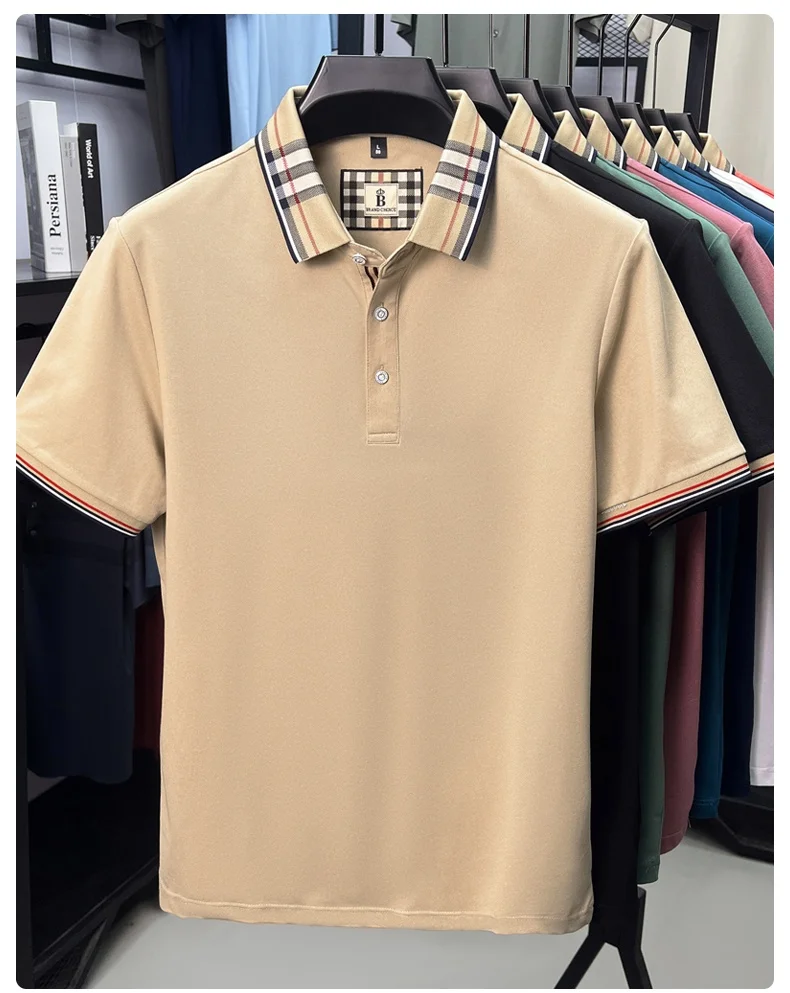 Luxury brand short sleeve polo shirt men's summer new silk cotton breathable fashion top casual business plaid lapel T-shirt
