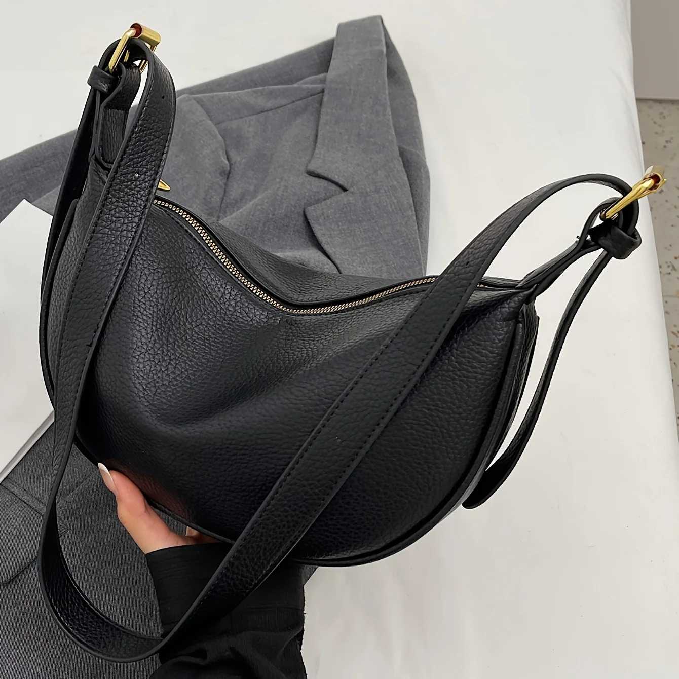 This black half-moon shoulder bag is a versatile accessory that can complement any style. It is suitable for various settings, including work, shopping, parties, and travel. Its timeless design ensures that it will never go out of fashion, making it a worthwhile investment for your wardrobe.