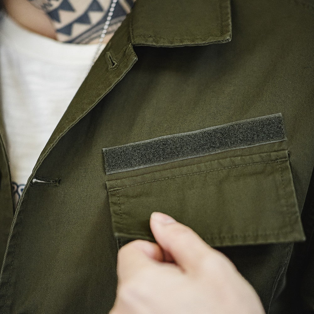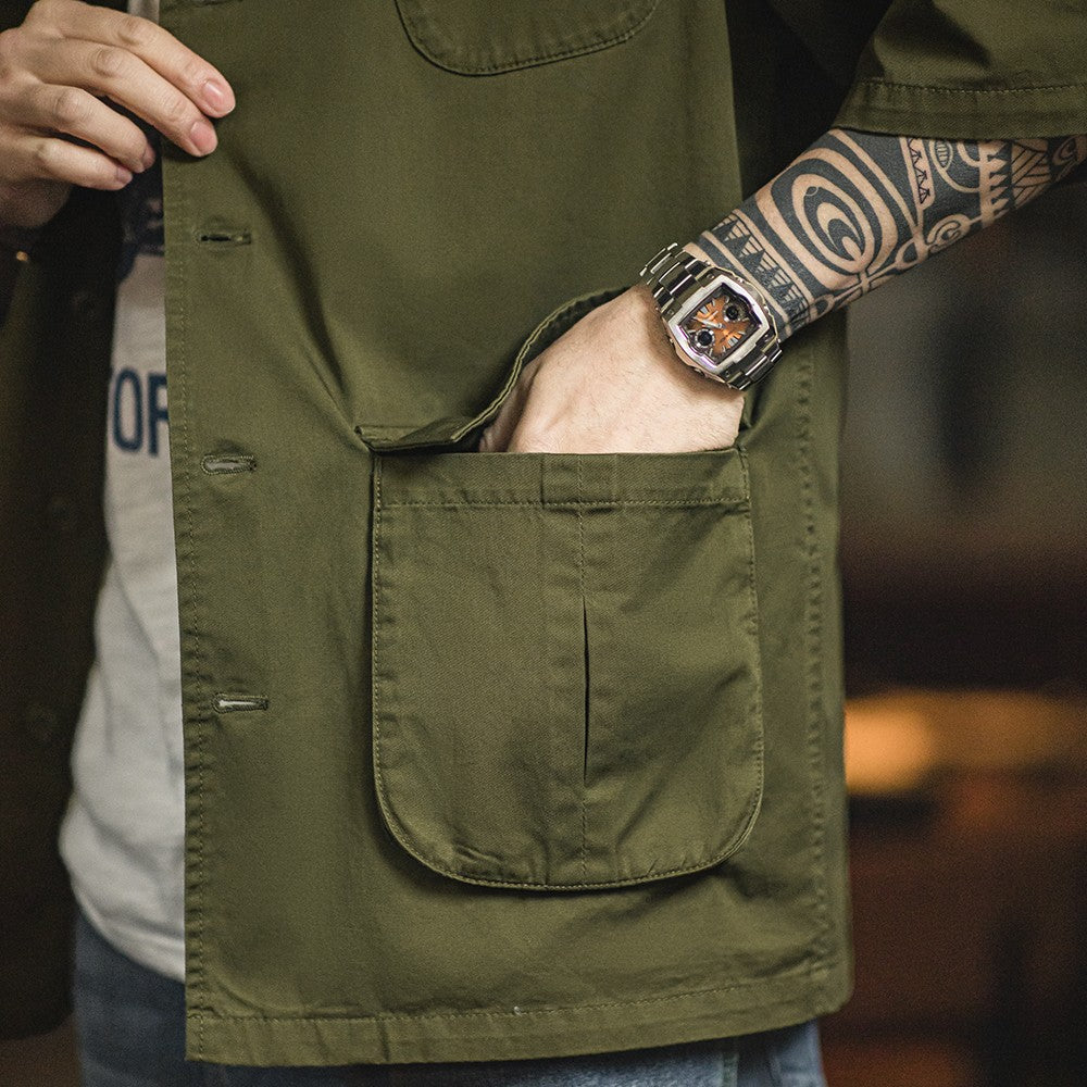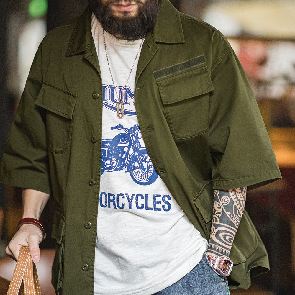 Maden Summer Vintage Four Pockets Short Sleeve Shirts for Men Cotton Green Loose Turn-down Collar Shirt Cargo Tops Male XL XXL
