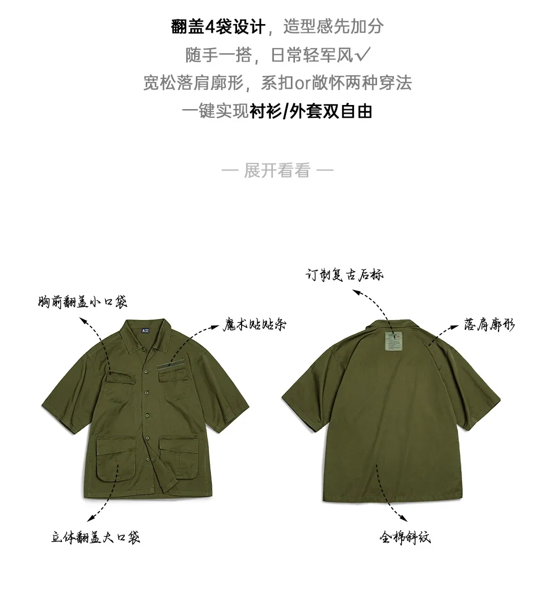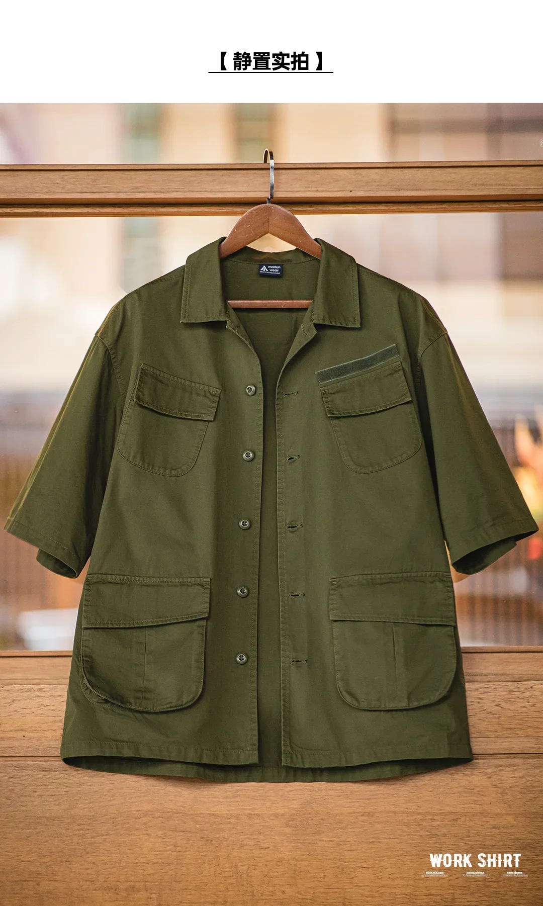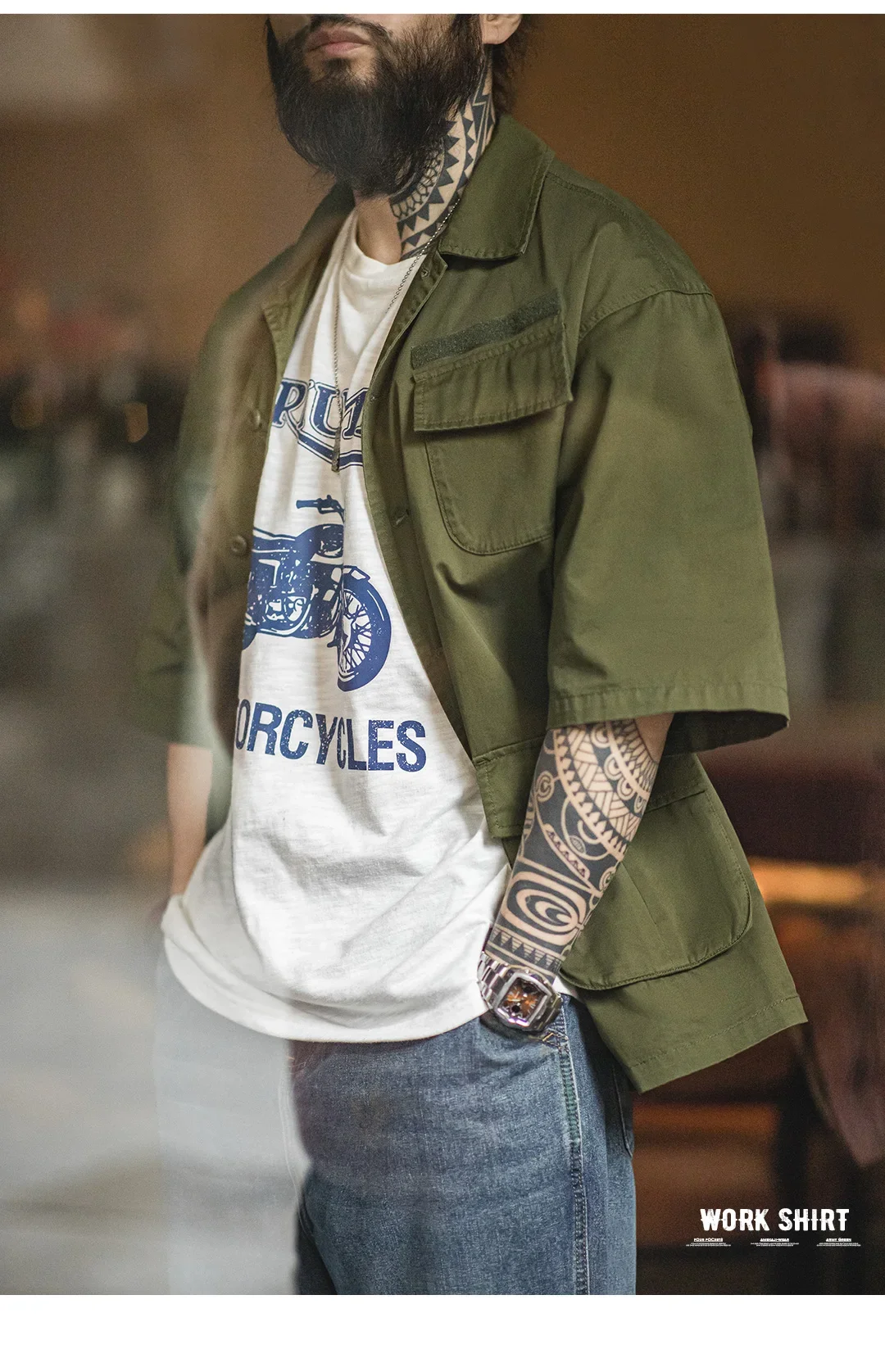 Maden Summer Vintage Four Pockets Short Sleeve Shirts for Men Cotton Green Loose Turn-down Collar Shirt Cargo Tops Male XL XXL