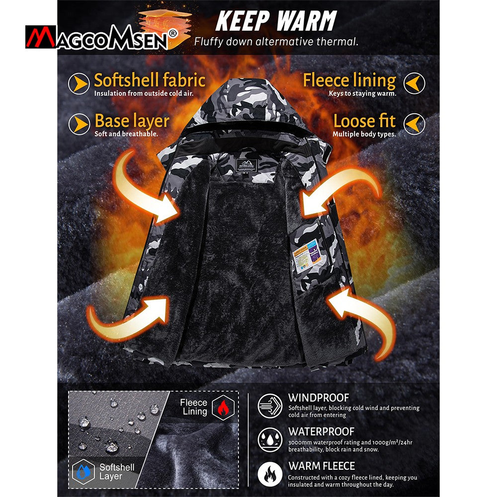 MAGCOMSEN Fleece Ski Jacket Men's Hooded Waterproof Thermal Thick Warm Camo Parka Removable Hooded Coats Winter Snowboard Anorak
