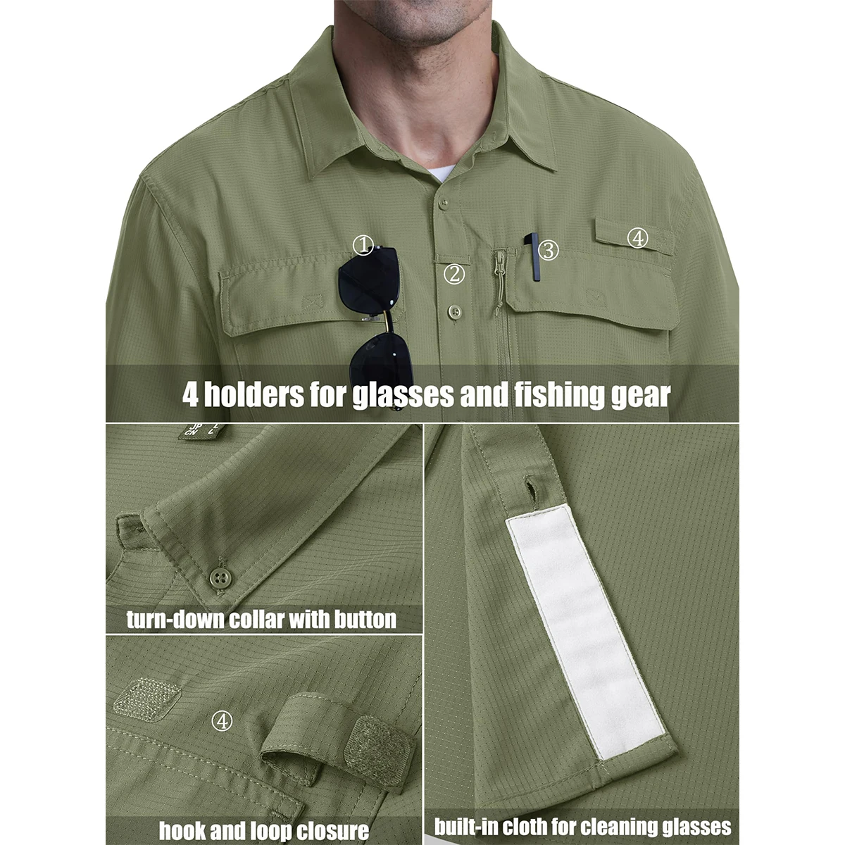 ● 【Versatile Design】Multiple loops on the front for hanging sunglasses, pens or fishing gear; 1 deep zipper pocket hiden for your essentials and 2 chest pockets for your tools; a built-in cloth at the hem for cleaning glasses; adjustable cuffs with 2 buttons.