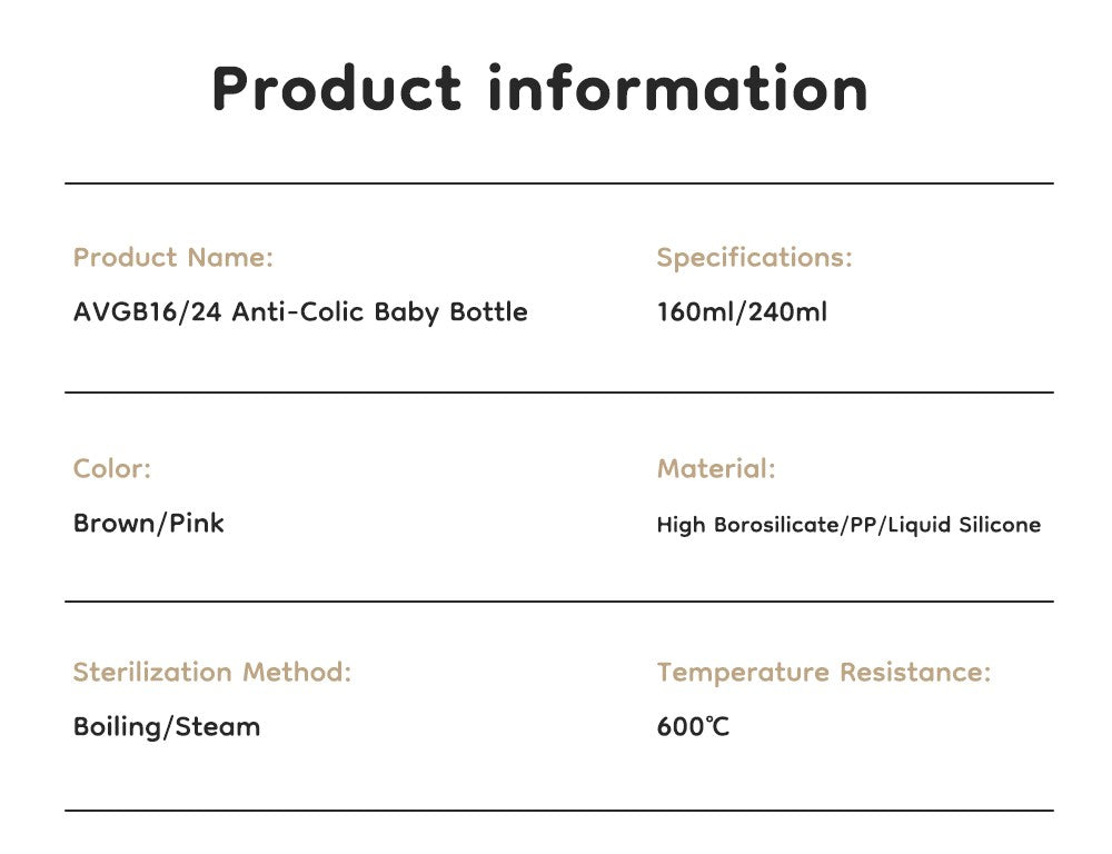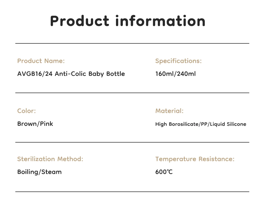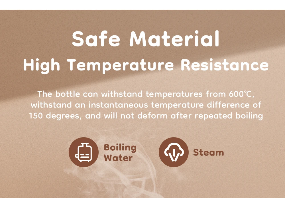 Bottle body: made of high borosilicate glass, sterilization method, boiled (3-5 minutes) or steamed (5-10 minutes)
