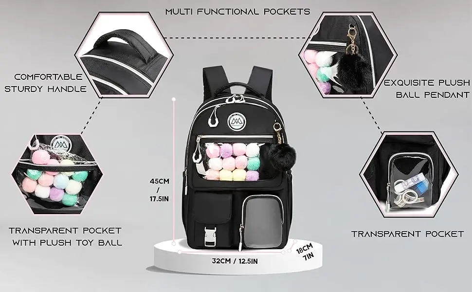 Case:9"[Large Capacity]The aesthetic backpack main compartment contains laptop pocket,fits for 15.6" laptop, iPad, folders, A4 magazines, books, wallet, kawaii dolls;3 front small pockets fits for notebook,keys,snacks or anything else you need in your daily life.2 side mesh pocket fit for bottle and umbrella.