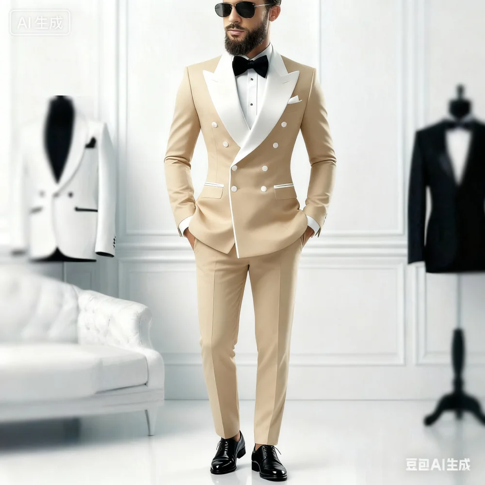 Men's 2-Piece Casual Smalking Set with White Lapel Blazer And Black Pants Wedding Groomsmen Suit for Ceremony And Festa