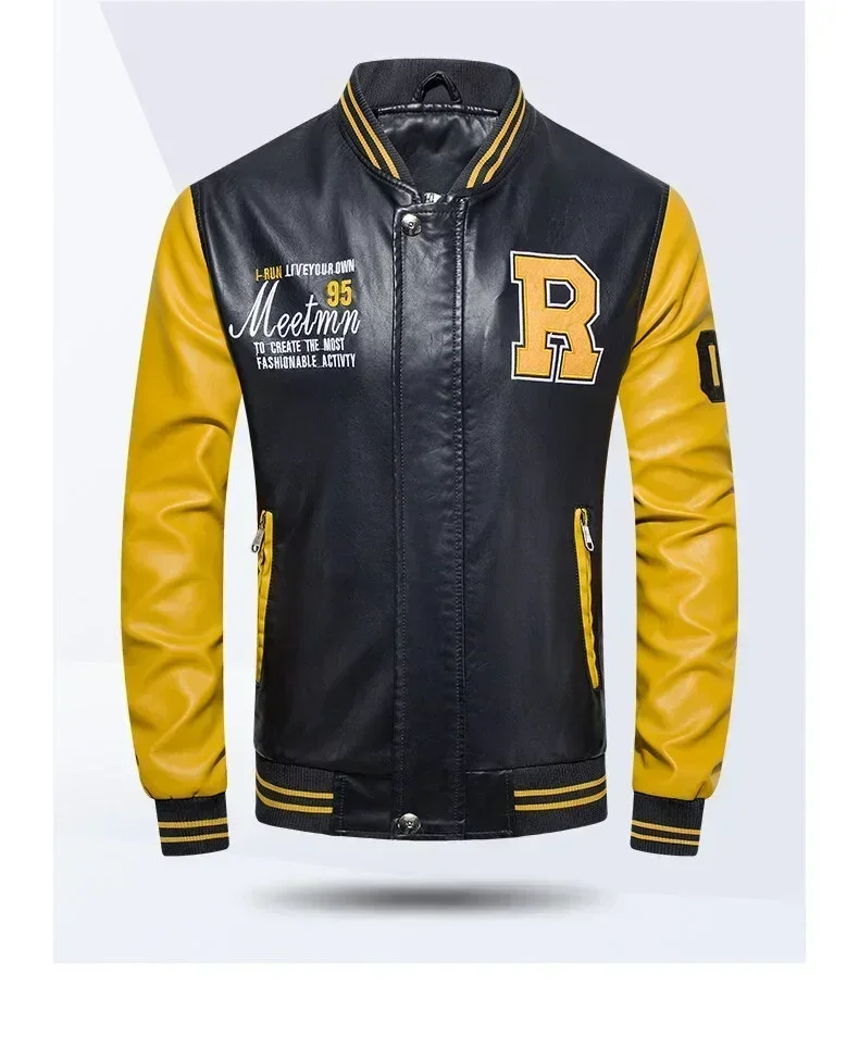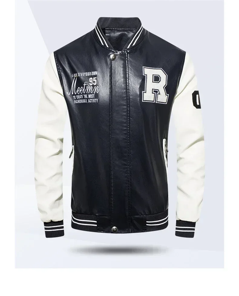 Men's American Baseball Collar Pilot Casual PU Spring and Autumn Leather Jacket Motorcycle Suit Leather Jacket Color Blocking