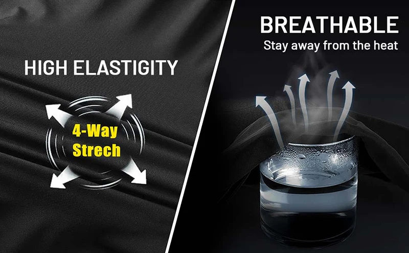 ?Fabric?85% Polyester, 15% Spandex. High Elasticity, Lightweight, Quick-drying, Breathable, Resistant to Water. Breathable fabric lets moisture out making sure you stay dry on the inside.