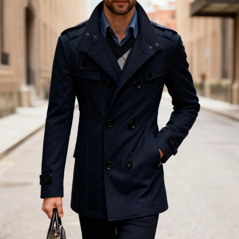 Men's Double-breasted Woolen Overcoat Fashion Solid Color Mid-length Jacket Luxury Light Business Stand Collar Trench Coat M-3XL
