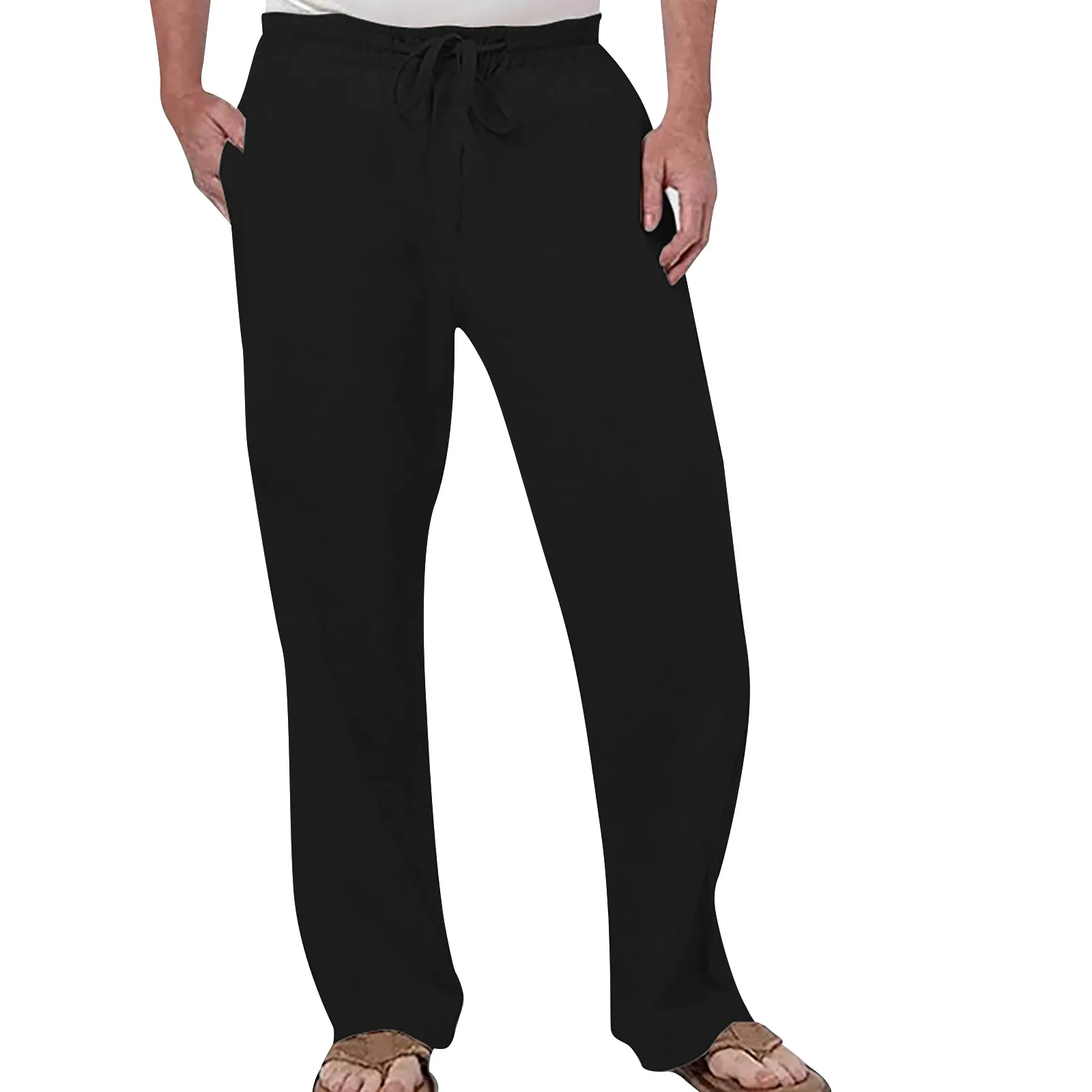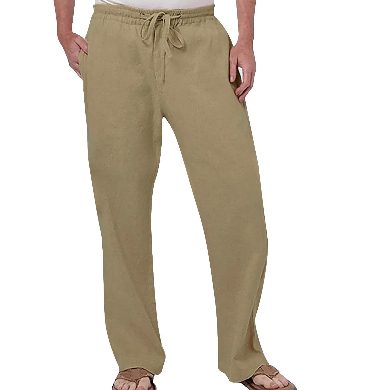 Mens Fashion Casual Solid Color Try Breathable Cotton And Linen Pocket Elastic Waist Large Size Pants Trousers