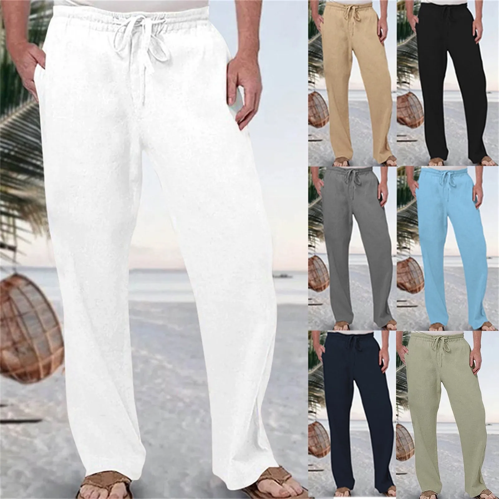 Mens Fashion Casual Pants Solid Color Breathable Cotton Linen Elastic Waist Straight Pants With Pockets Large Size White Pants