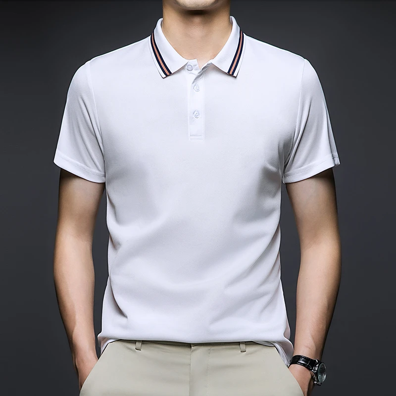 Men's Fashion Solid Short Sleeved Striped Lapel Polo Shirt Summer Breathable Comfortable Top