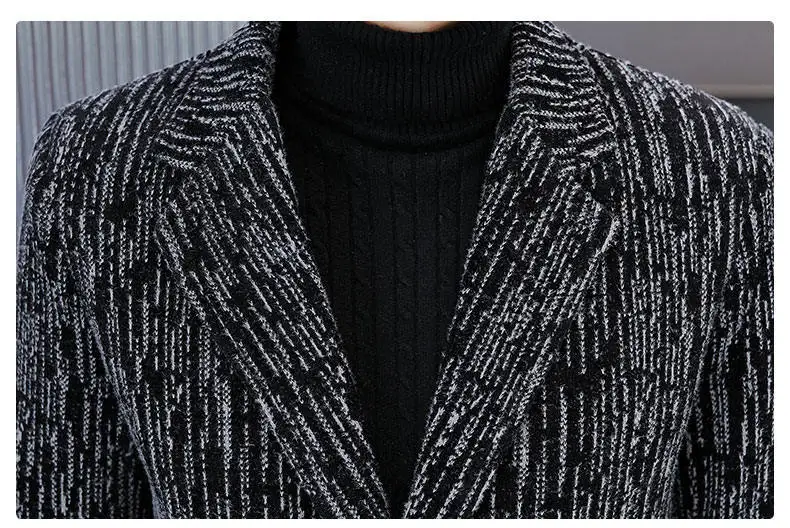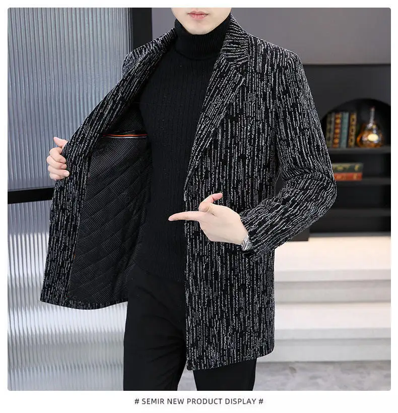 This mid-length overcoat is a modern addition to any man's winter wardrobe, blending style with functionality.