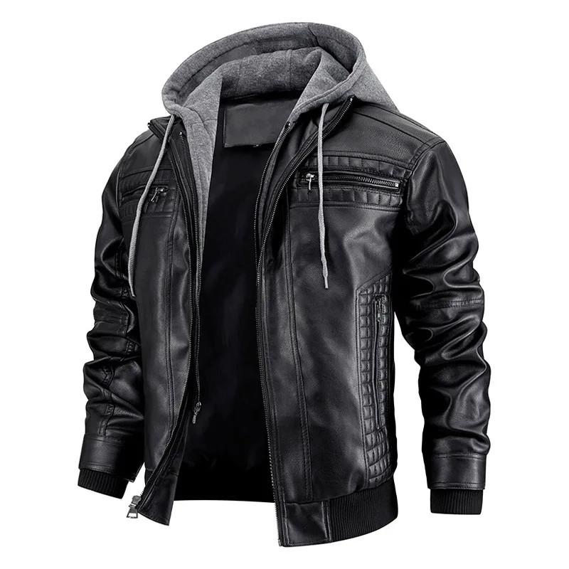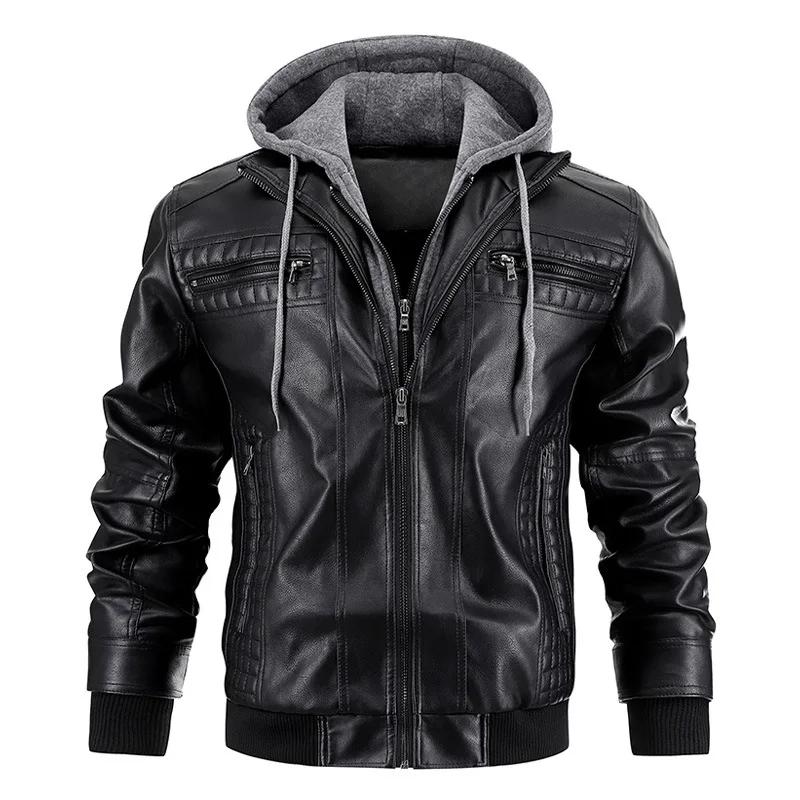 Men's PU Leather Jacket Hooded Motorcycle Slim Fit Casual Coats Men Autumn Winter Windproof Hat Detachable Biker Leather Outwear