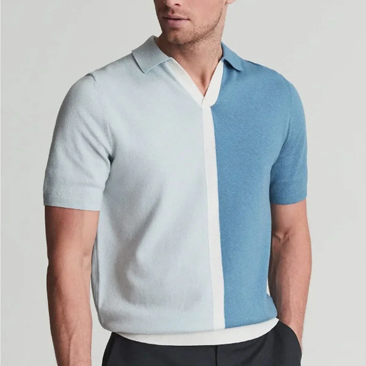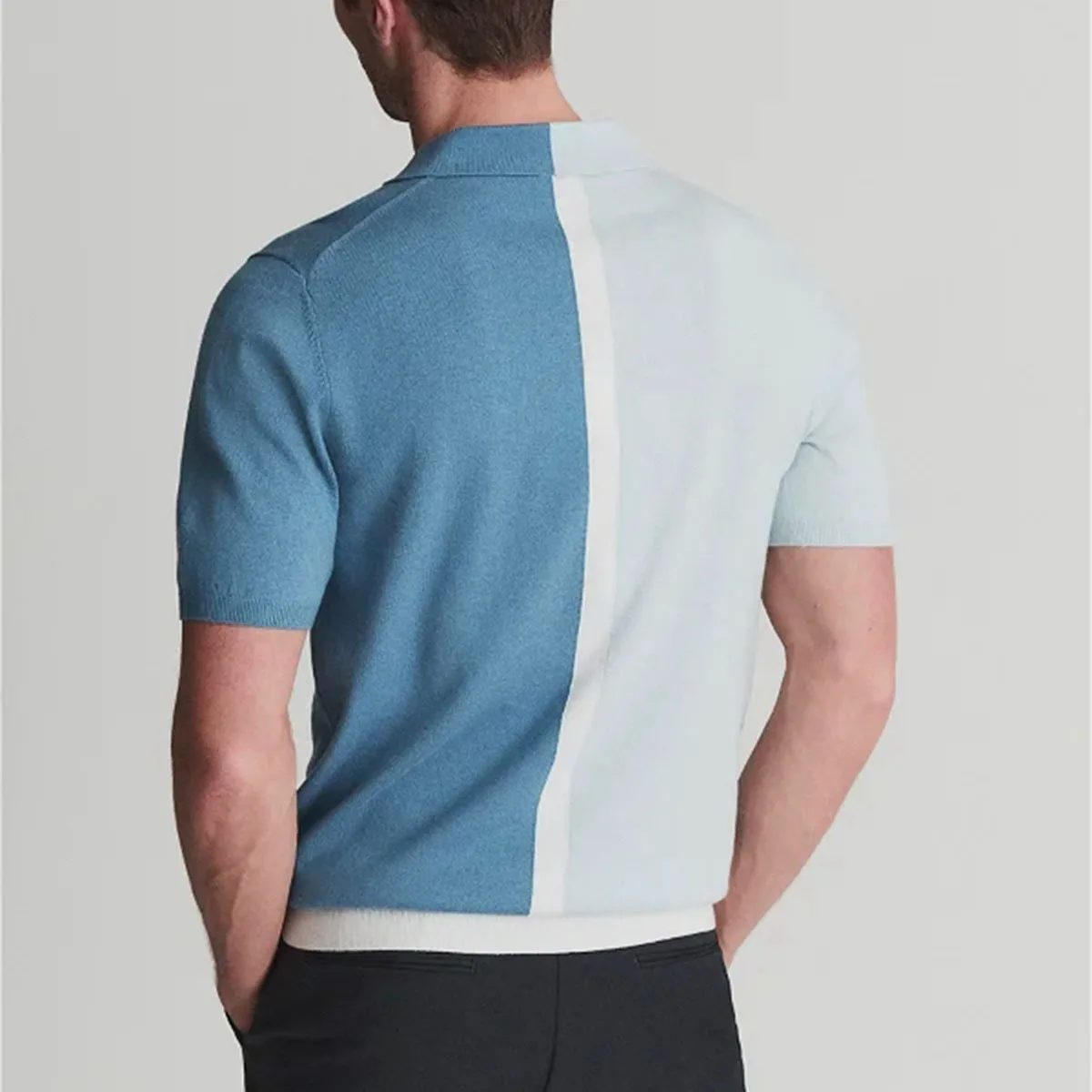 Men's ribbed knitted lapel contrasting shirt, breathable striped pullover casual wear, comfortable and high-quality men's shirt