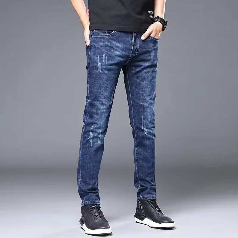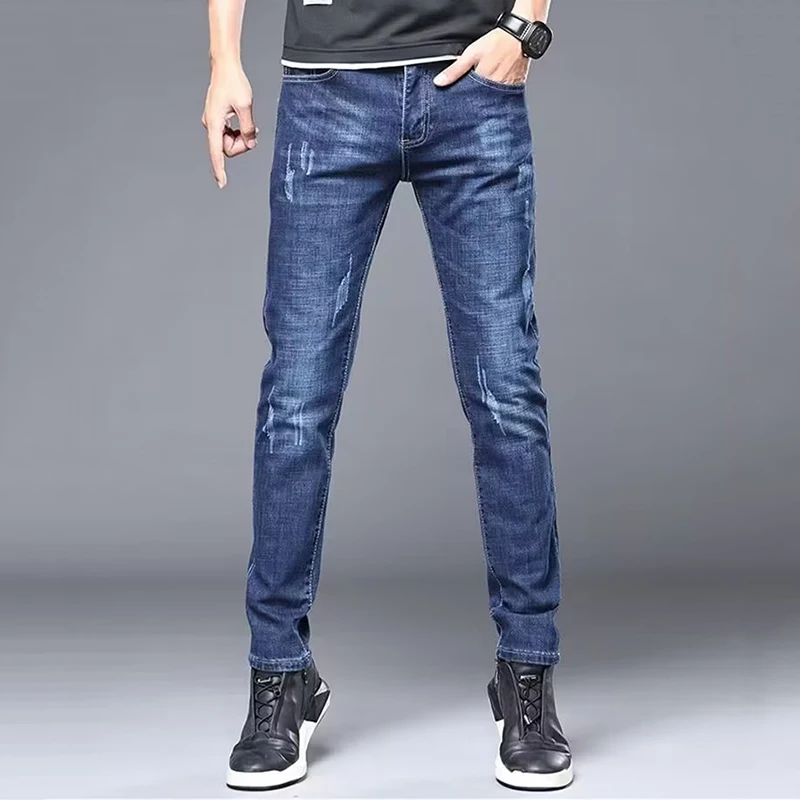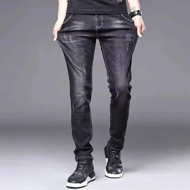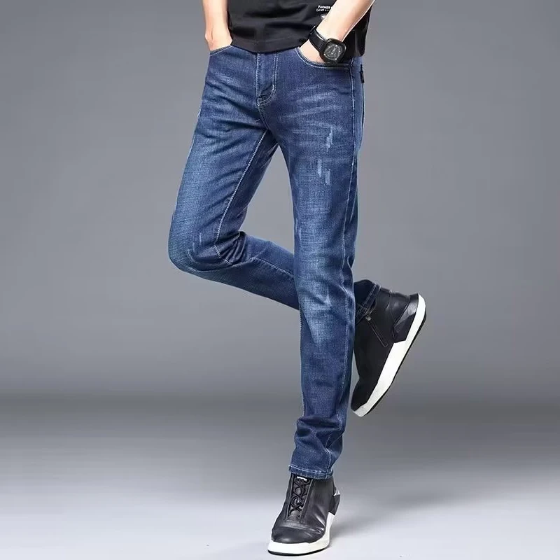Men's Stylish Classic Business Casual Jeans Four Seasons Wear Black Blue Pants Middle-waist Leggings Denim Fabric Trousers Male