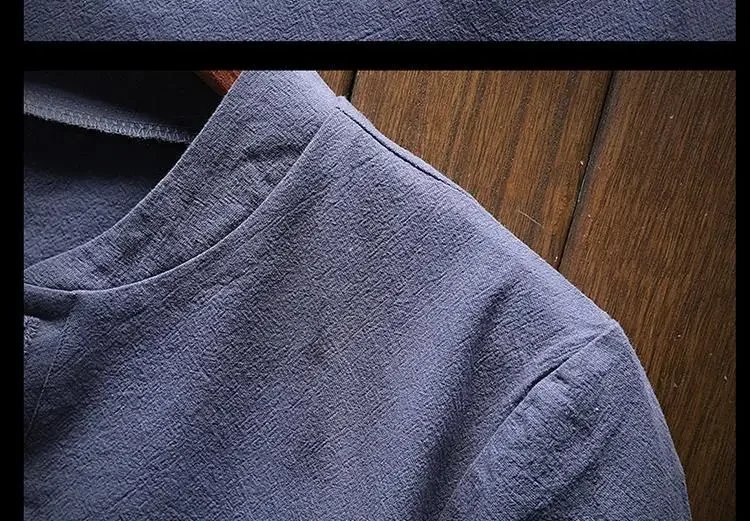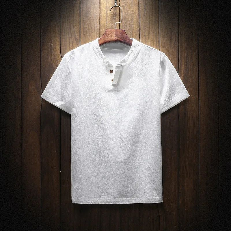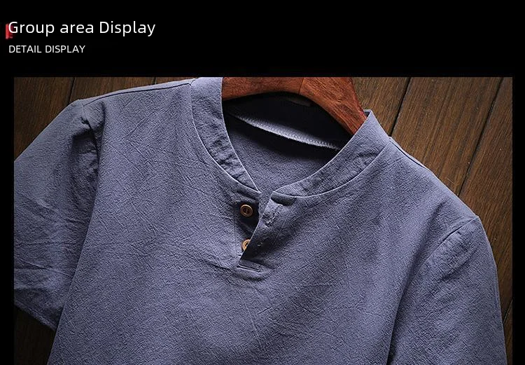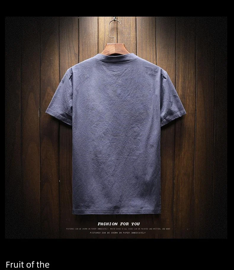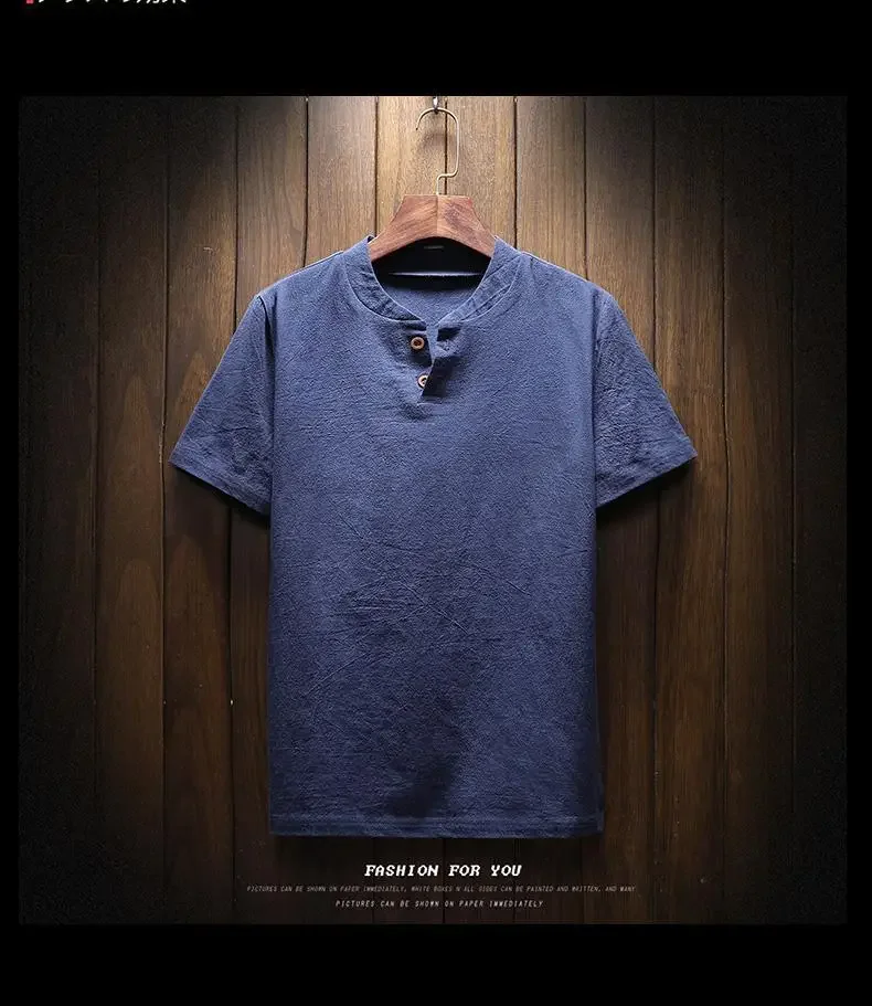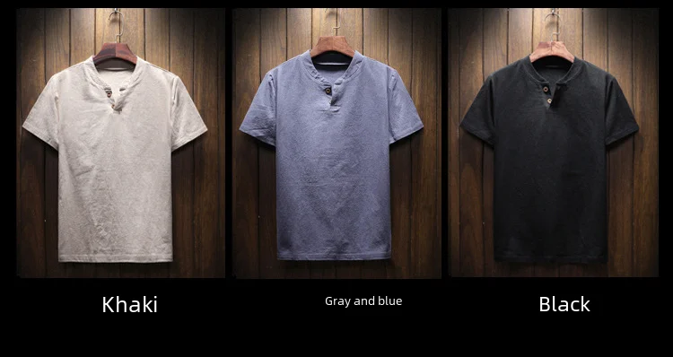 Men's Summer Loose-fit Short Sleeve Linen T-shirt Cotton Linen Body Solid Color Breathable V-neck Thin Top
