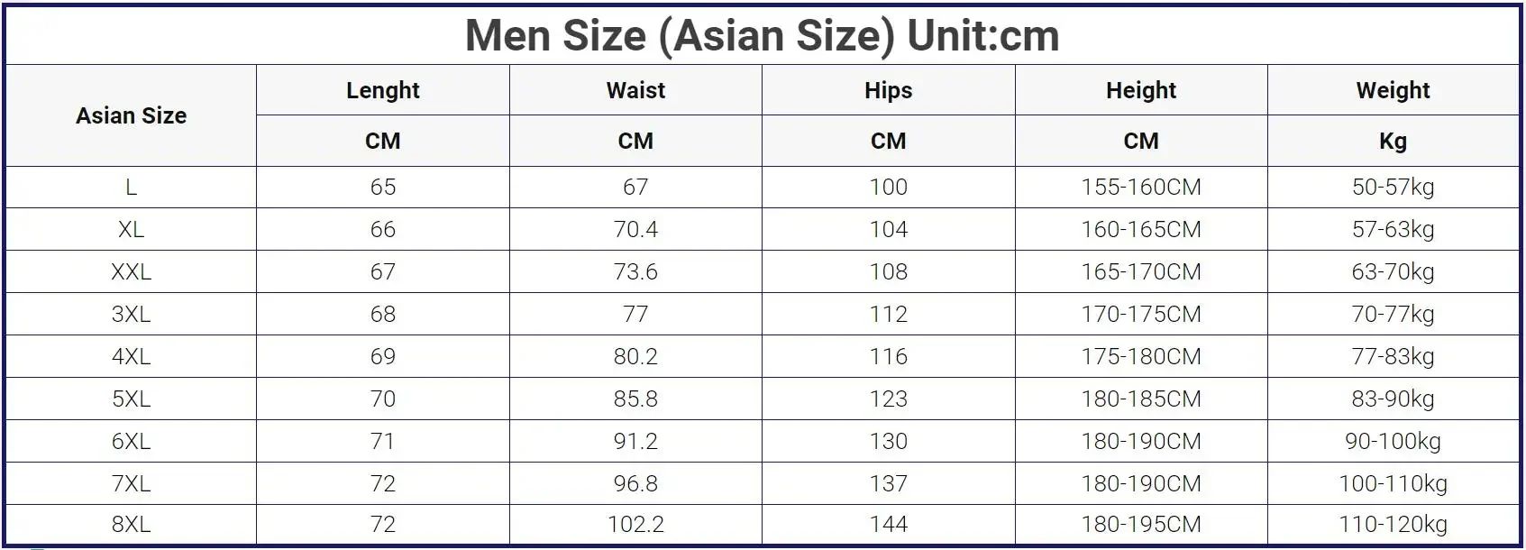 Men Size (Asian Size) Unit:cm | |||||