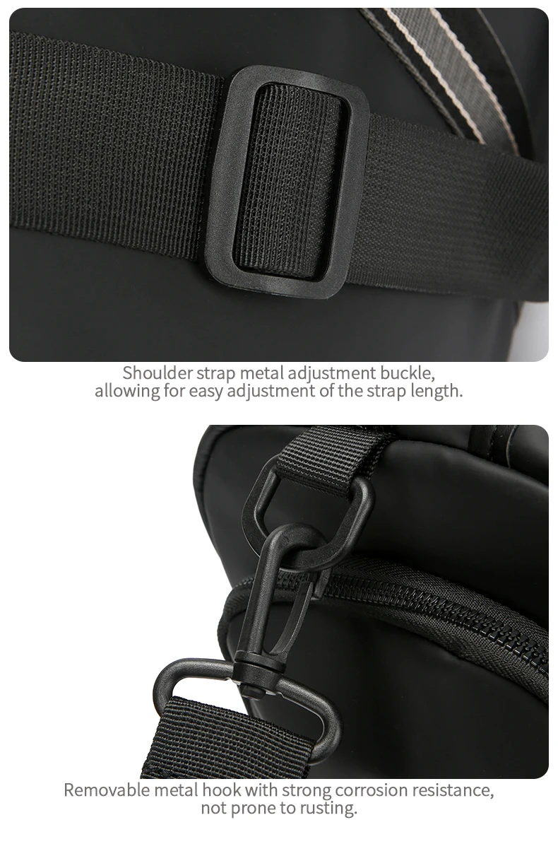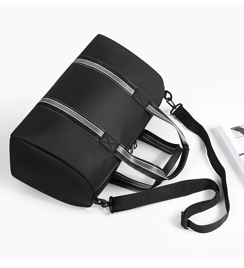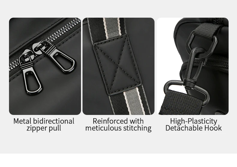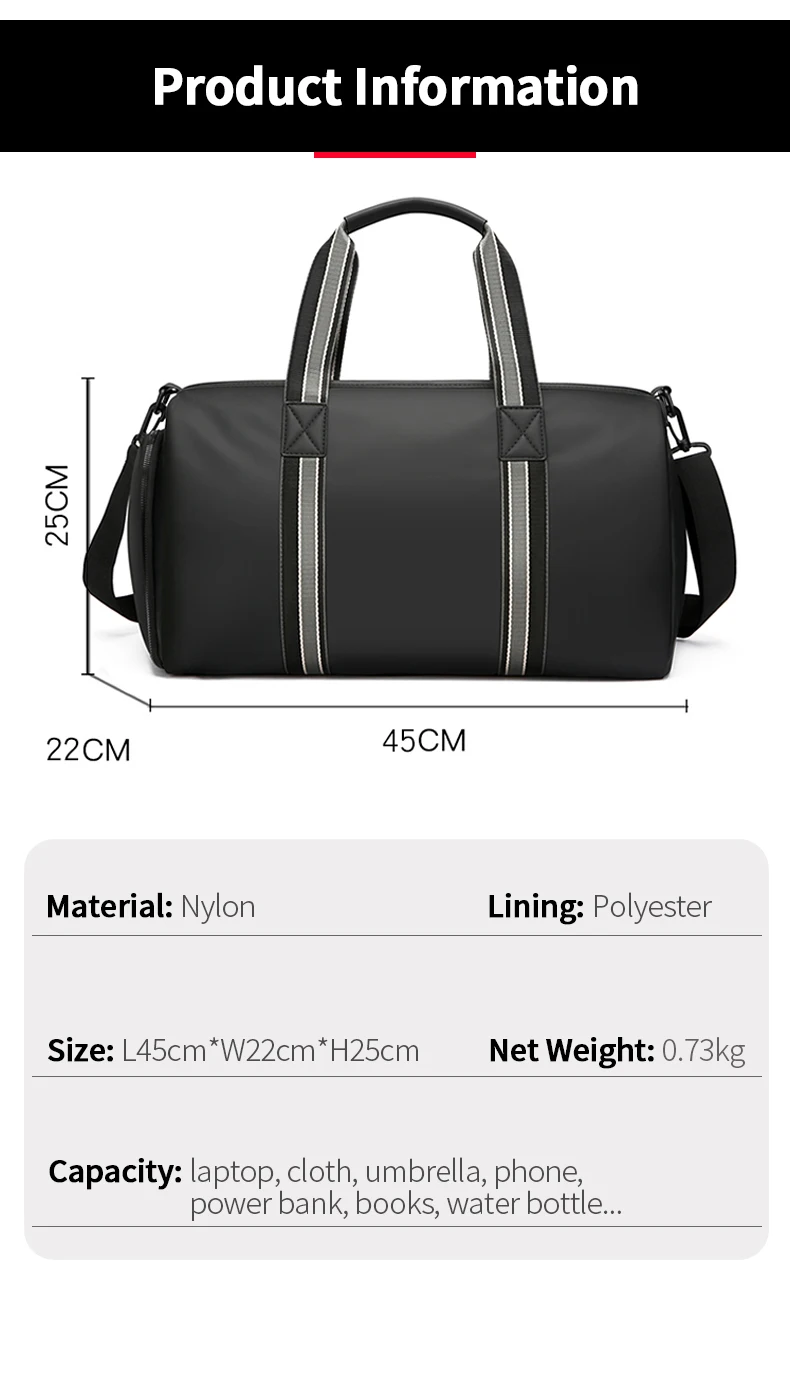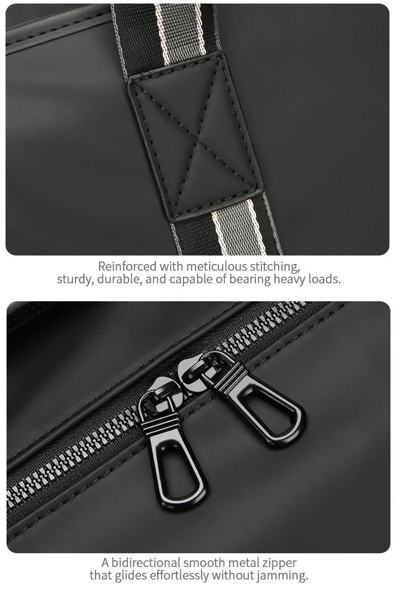 Details: Sturdy and comfortable handle; smooth zippers; high-quality metal hardware; detachable and adjustable shoulder strap; air hole on shoe compartment