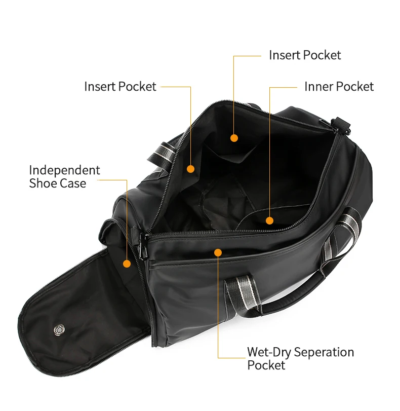 Structure: Main compartment for 15.6” computer*1, with inner insert pocket *3; Wet-dry separation pocket*1; Shoe Compartment*1